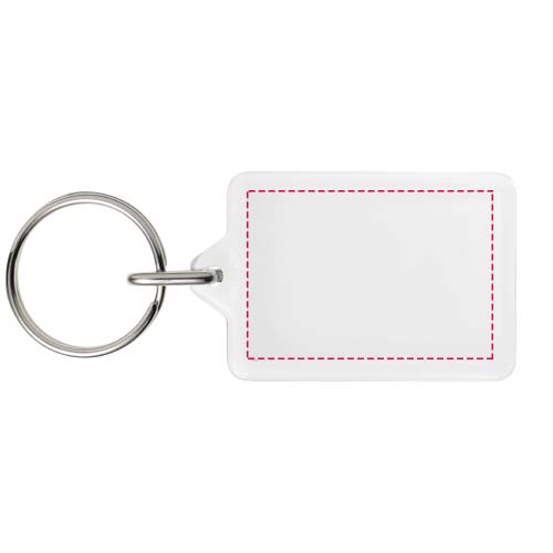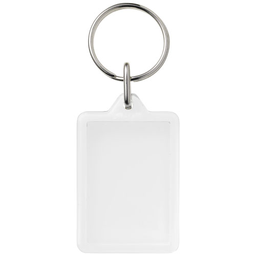 Portachiavi Y1 rettangolare trasparente con anello in metallo diviso. L'anello di metallo a loop ha un profilo piatto ideale per le spedizioni. Dimensioni dell'inserto stampato: 3,5 cm x 2,4 cm.