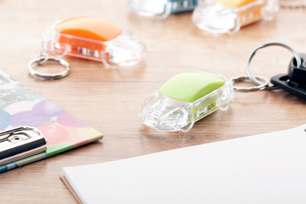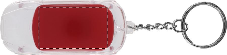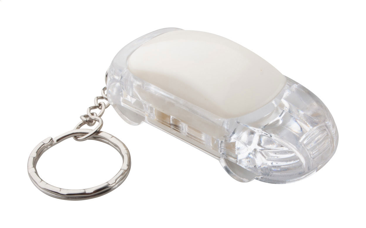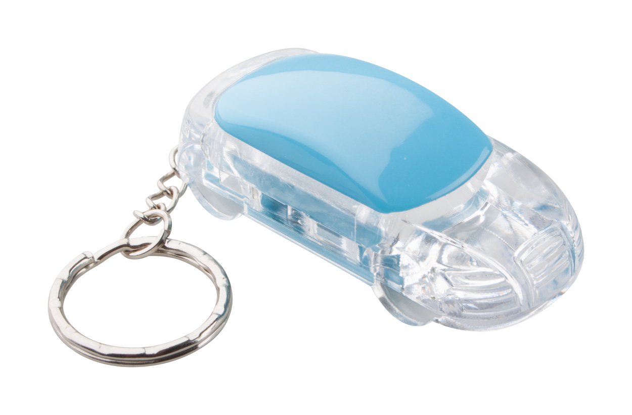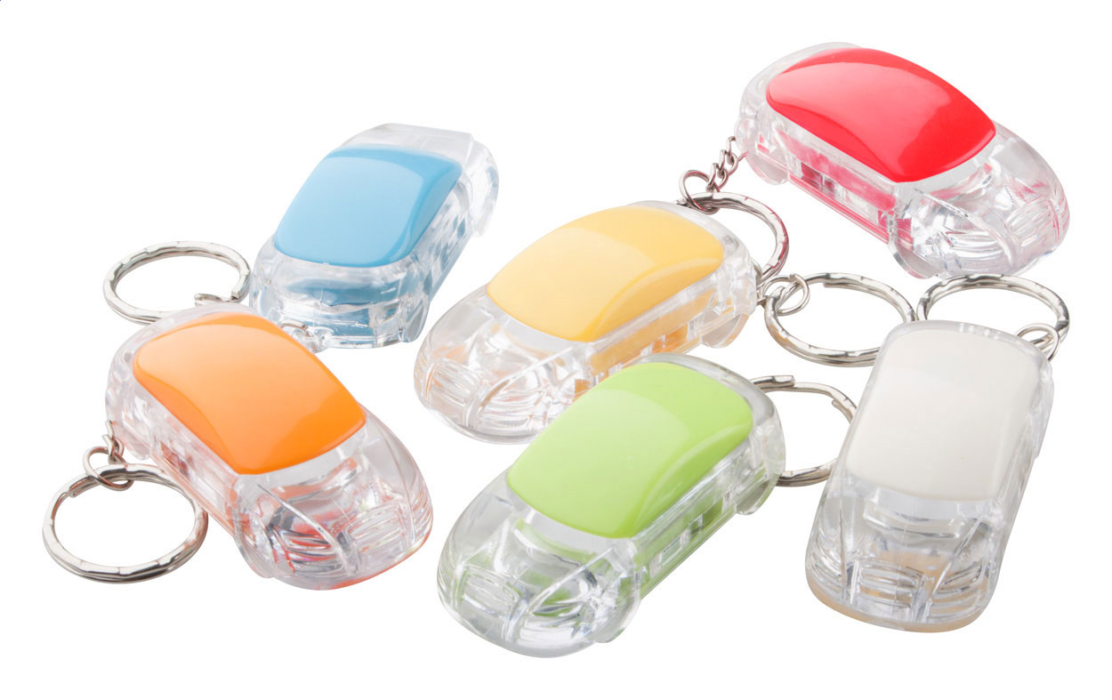 Portachiavi in plastica a forma di auto con luce LED bianca e anello portachiavi in metallo. Batteria a bottone inclusa.