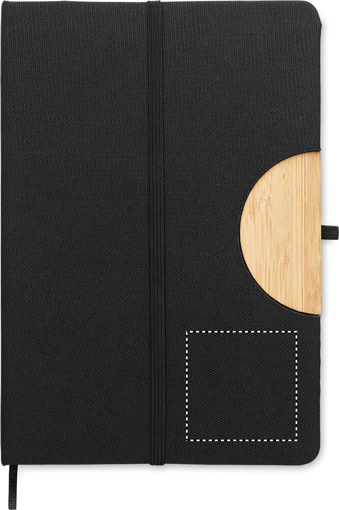 Quaderno A5, copertina rigida in RPET 600D con dettagli in bamboo e supporto smartphone, rilegato, 160 pagine a righe (80 fogli). Carta riciclata da 70 gr/m². Elastico, nastro segnapagina e portapenne.