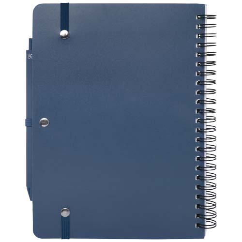 Blocco note formato A5 con copertina rigida, realizzato in plastica riciclata recuperata in prossimità dagli oceani. Si compone di 80 fogli a righe di carta color crema da 70 g/m², presenta angoli arrotondati, chiusura con elastico e passante per penna. Anche la penna a sfera con inchiostro nero è realizzata con plastica riciclata recuperata in prossimità dagli oceani. Capacità di scrittura: 1000 metri. Dimensione del pennino: 1,0 mm. Colore inchiostro: Black