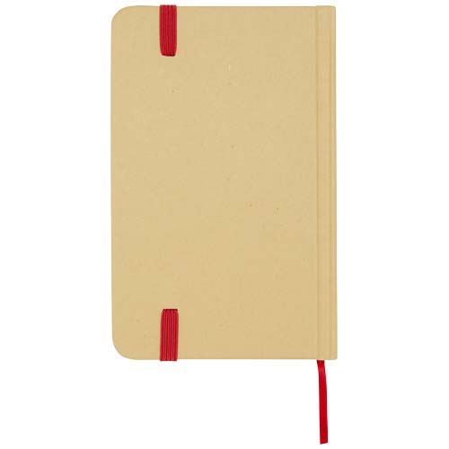 Blocco note con copertina rigida in cartone riciclato formato A6, con angoli arrotondati composto da 96 fogli bianchi di carta da 70 g/m² e una copertina morbida. Dispone di chiusura elastica e nastro segnalibro. Carta certificata FSC.