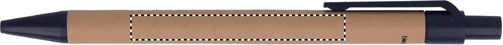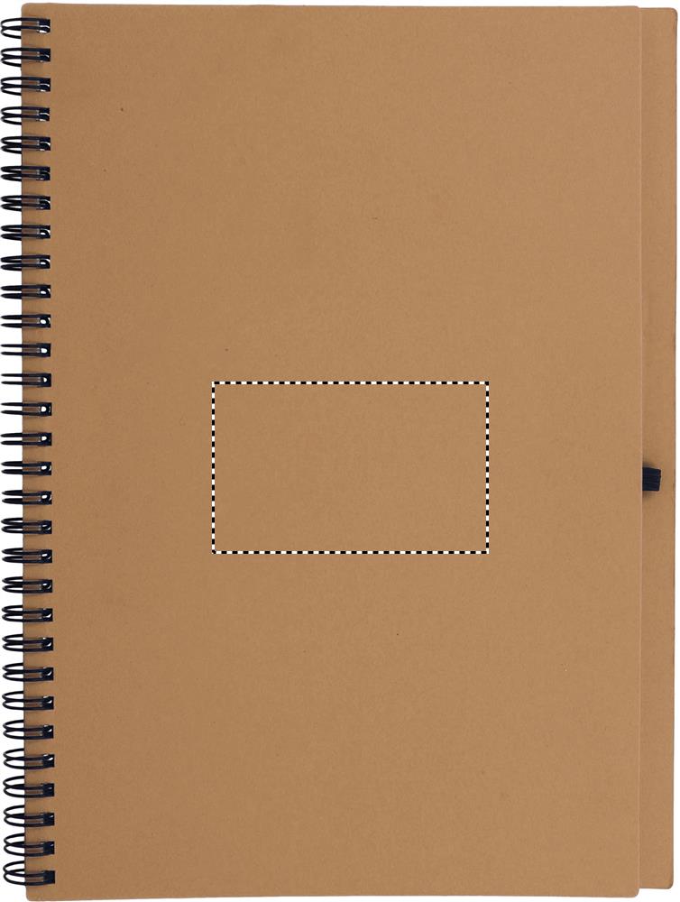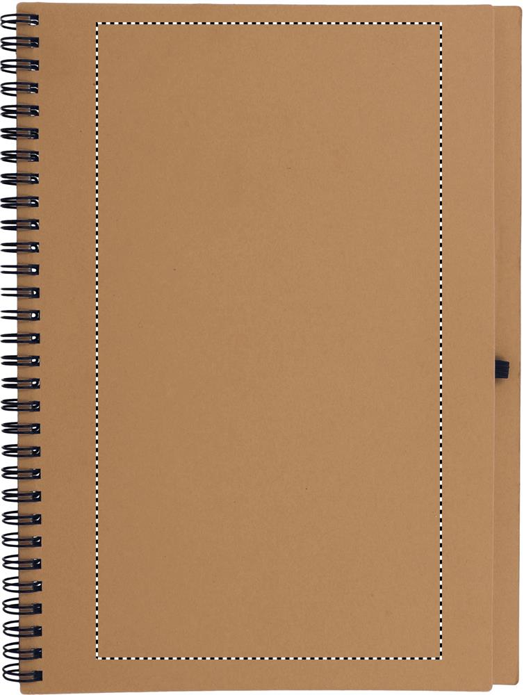 Notebook in carta riciclata con penna. Doppia spirale. 140 pagine di carta riciclata normale (70 fogli). Penna a sfera a pulsante in cartone riciclato e plastica biodegradabile. Inchiostro blu. Portapenne elastico nero.