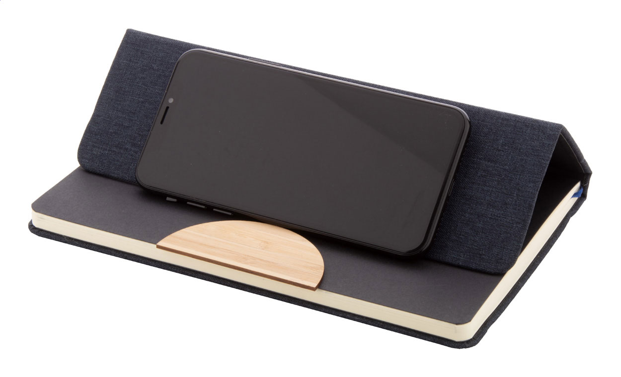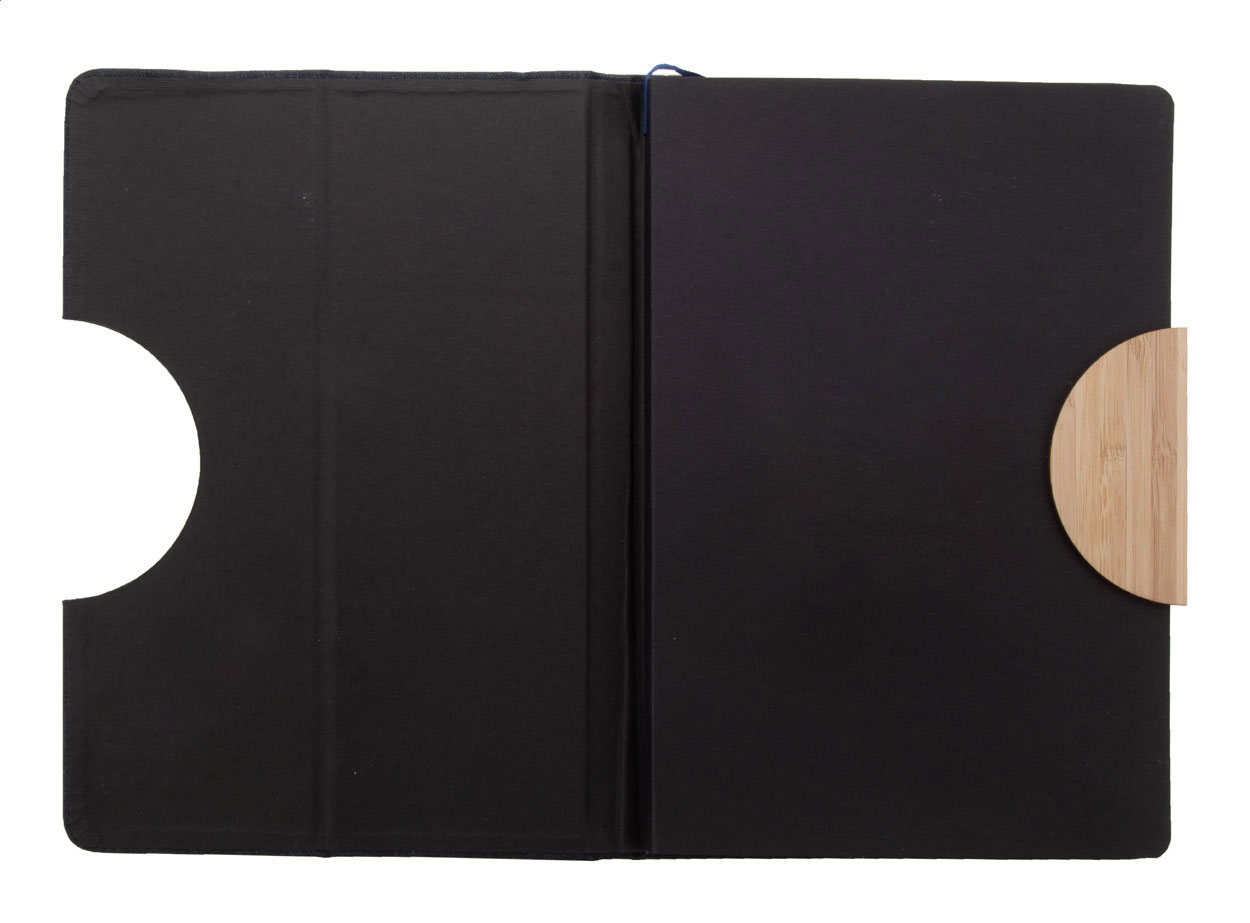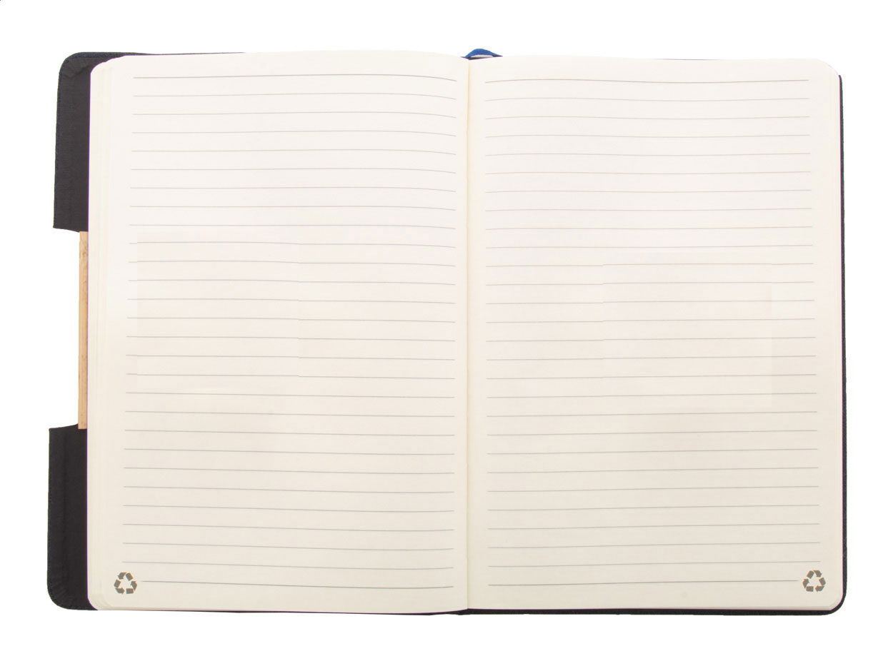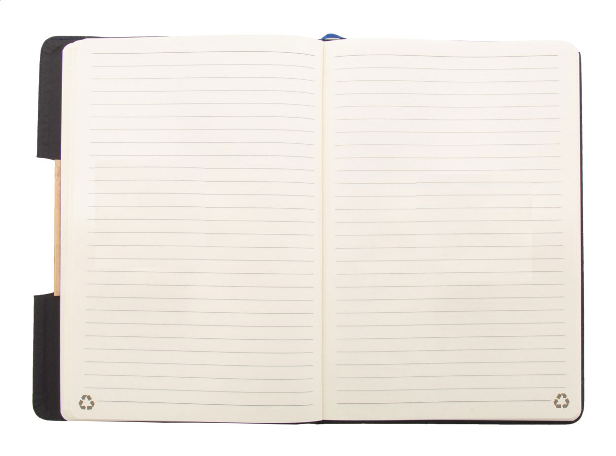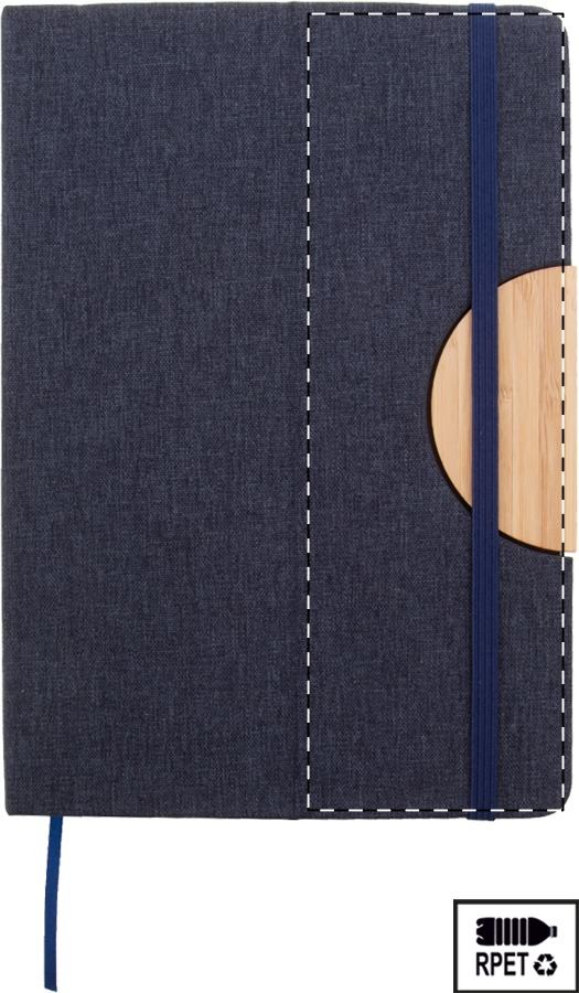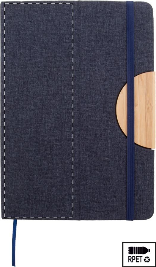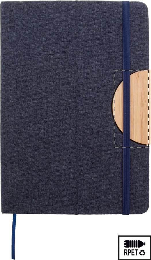 Quaderno formato A5 con copertina in poliestere RPET, con 80 fogli a righe in carta riciclata, inserto in bambù, funzione portacellulare, segnalibro ed elastico in gomma.