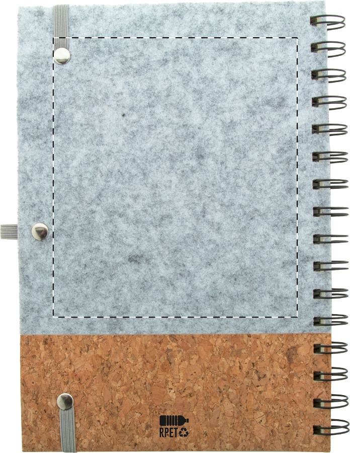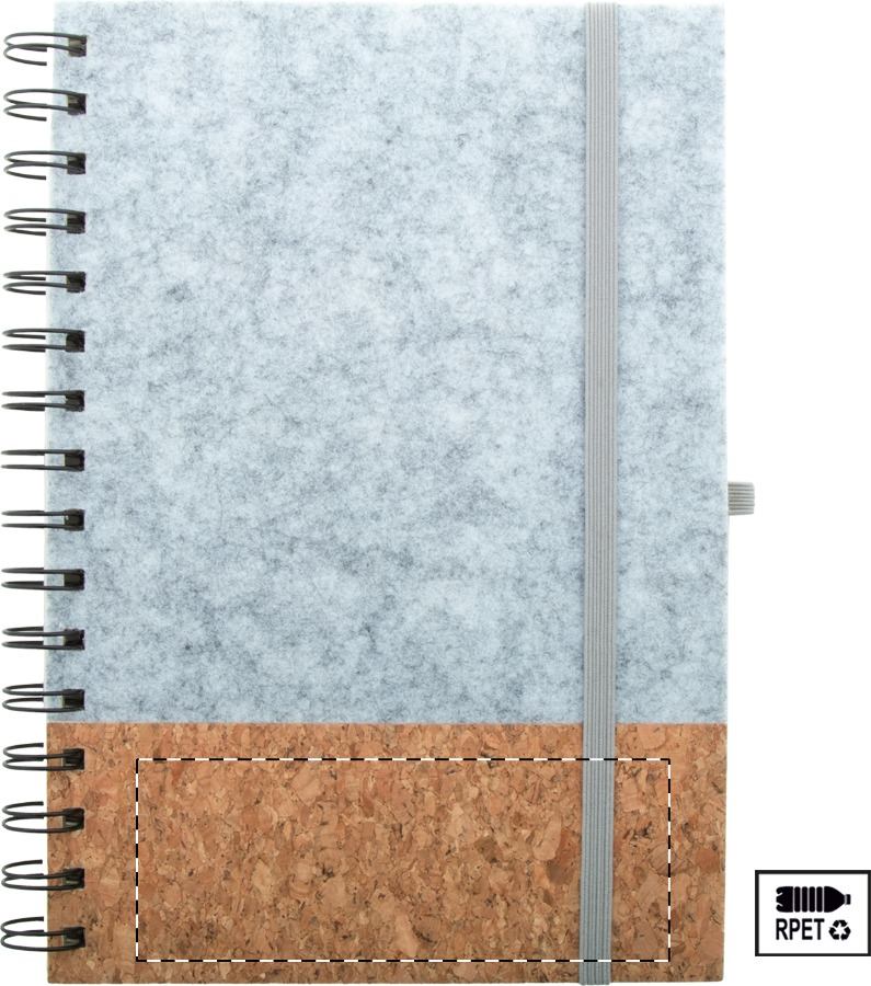Quaderno a spirale formato A5 con copertina in feltro RPET e sughero naturale, 70 fogli a righe in carta riciclata, cinturino in gomma e portapenne.