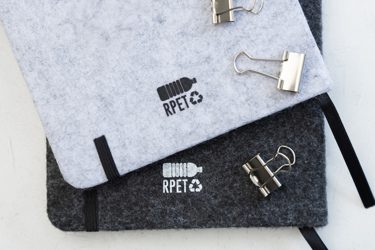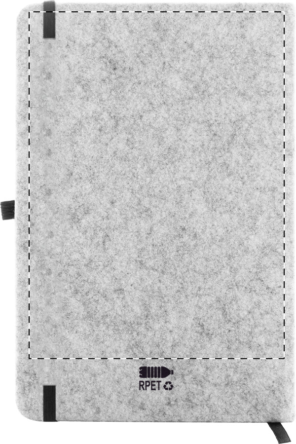 Quaderno formato A5 in feltro RPET con 80 fogli in carta riciclata a righe, segnalibro, elastico in gomma e portapenne.
