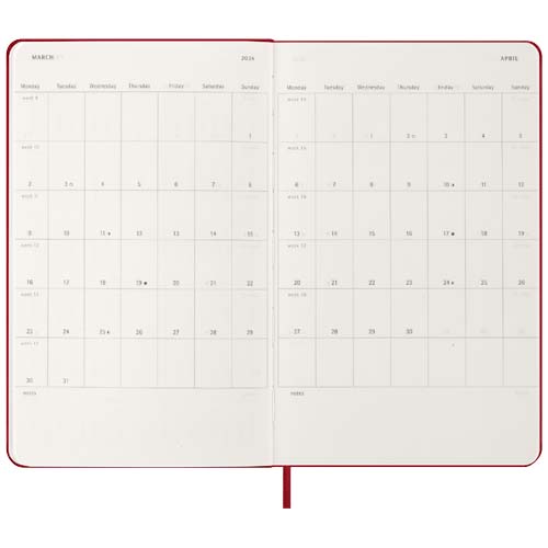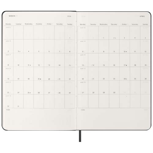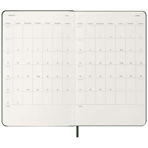 Agenda giornaliera 12 mesi Moleskine con copertina rigida. Con durata gennaio-dicembre 2026, dispone di una carta priva di acidi color avorio, una chiusura con elastico nero, un segnalibro a nastro, una tasca interna espandibile in colore coordinato, adesivi per la personalizzazione e adesivi dell'anno per il dorso. Carta pergamena. FSC.