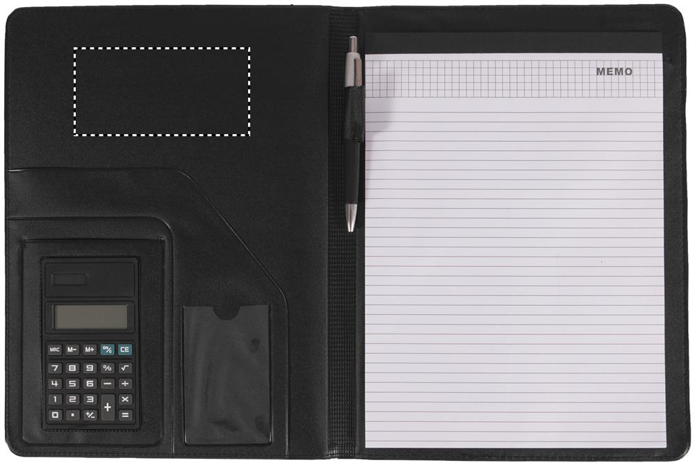 Portadocumenti A4 in ecopelle. Blocco note da 20 fogli a righe. Calcolatrice a energia solare. Penna a sfera in metallo. Inchiostro blu.