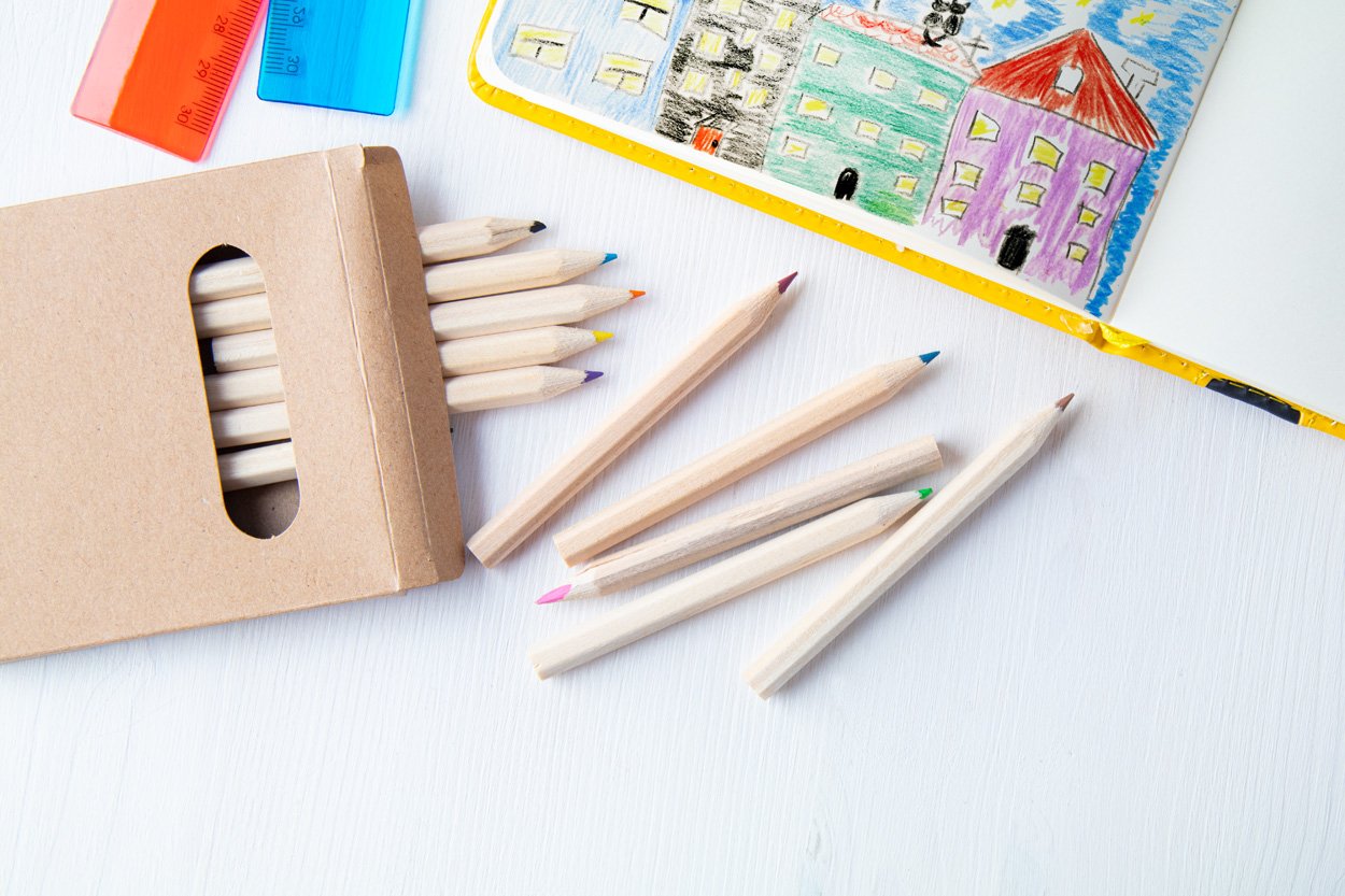 Set 12 matite colorate in legno confezionate in una scatola di cartoncino.