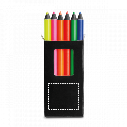 Scatola con 6 piccole matite fluorescenti in legno per colorare. 90 x 10 x 48 mm