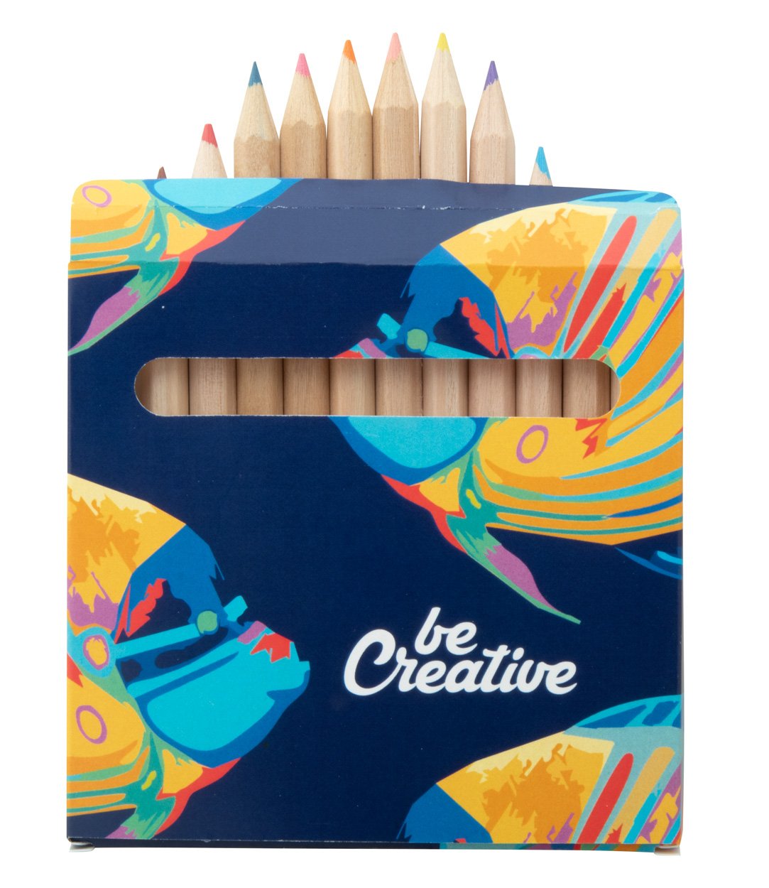 Set 12 matite colorate in legno, in confezione di cartoncino totalmente personalizzabile. Il costo comprende la personalizzazione con stampa digitale. MIQ: 100pz.