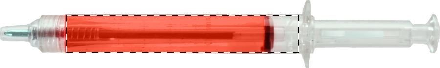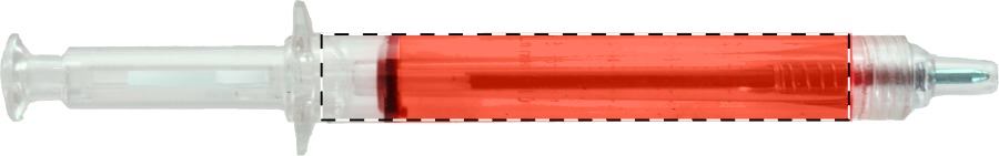 Penna a sfera in plastica a forma di siringa con corpo trasparente riempito di liquido e refill blu.