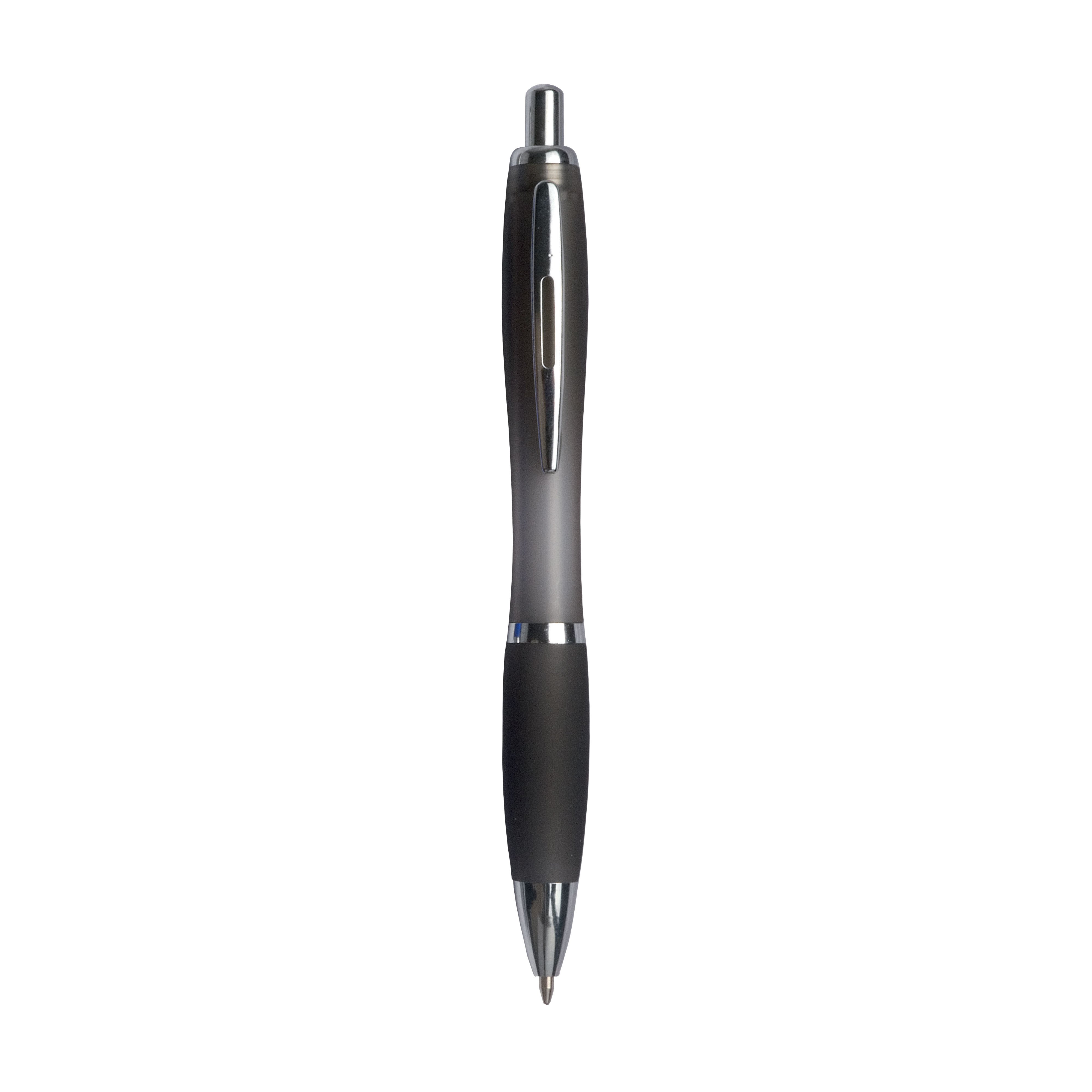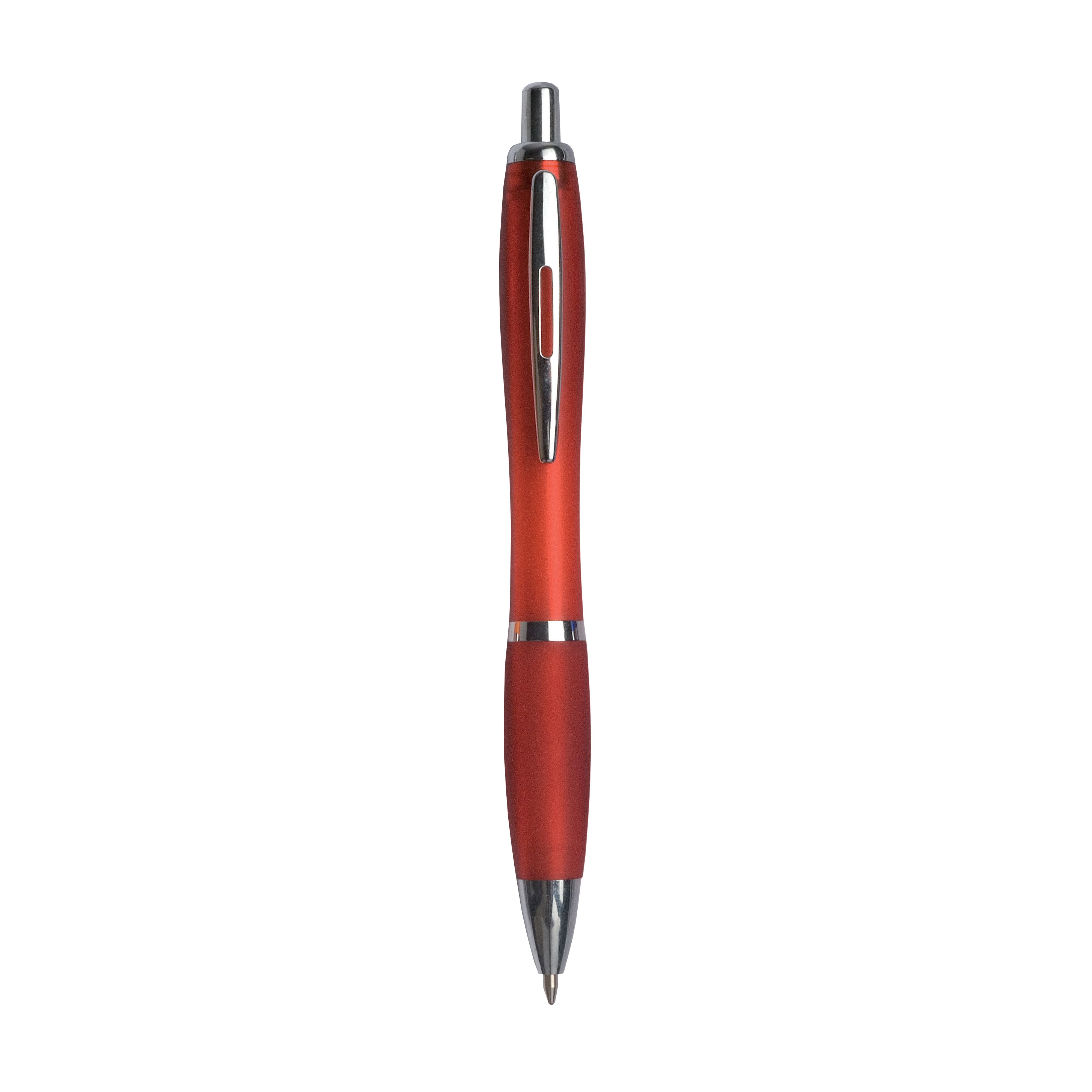 Penna a scatto in plastica abs, refill jumbo nero, con fusto colorato, impugnatura gommata in tinta e clip in metallo.