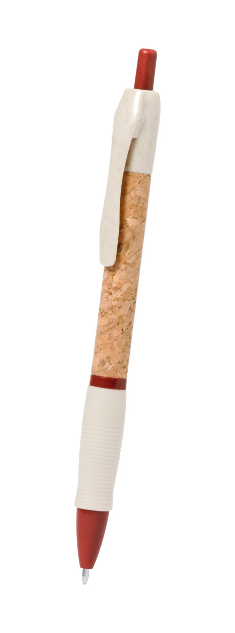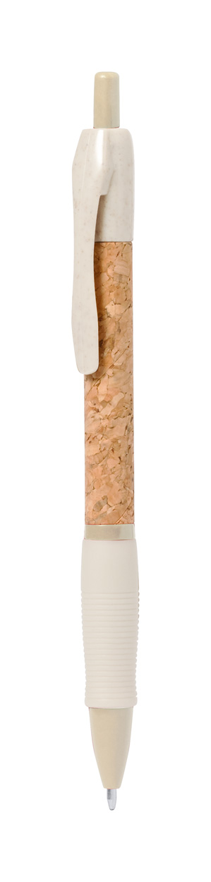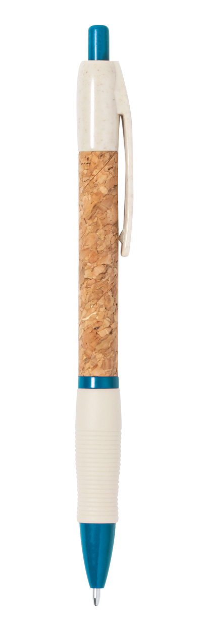 Penna a sfera con refill blu, in ecologica plastica a base di paglia di grano con fusto rivestito in sughero naturale ed impugnatura in gomma.