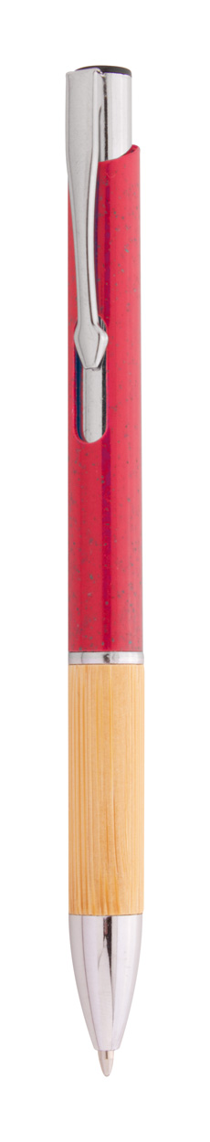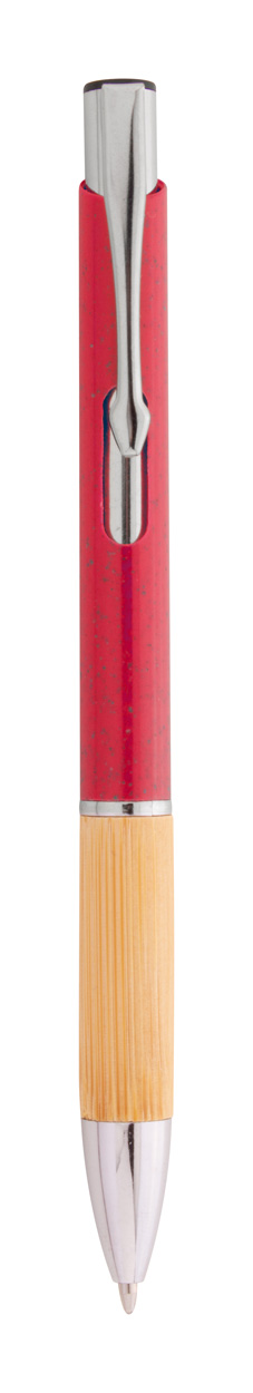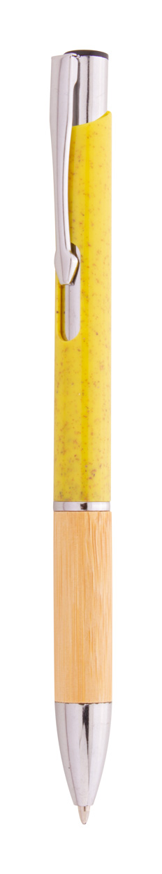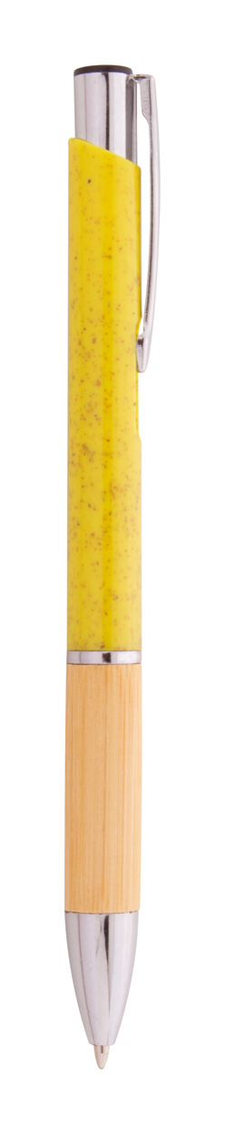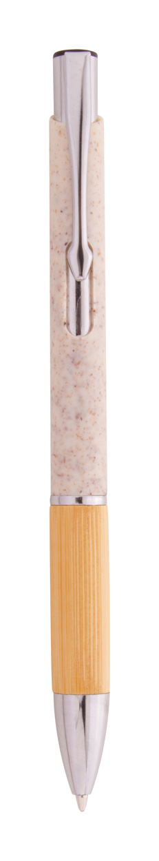 Penna a sfera in plastica ecologica di paglia di grano con impugnatura in bambù e parti in metallo. Con refill blu.