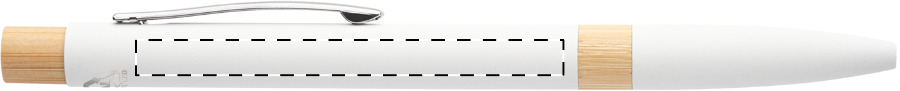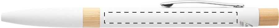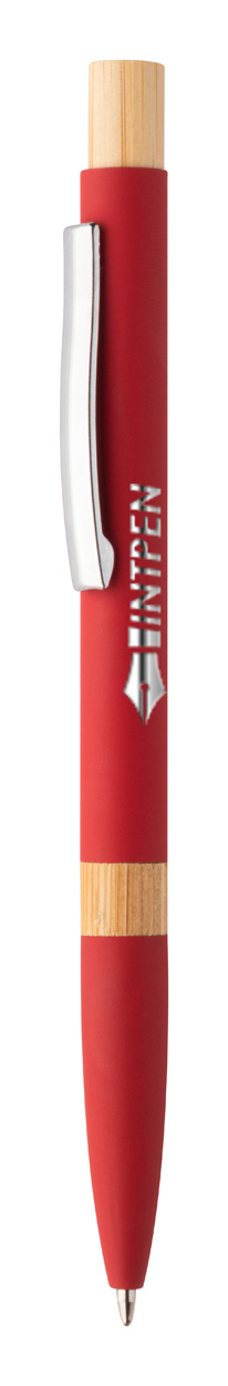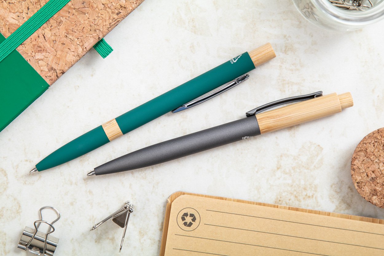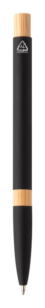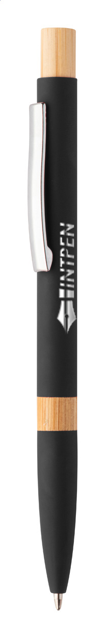 Penna a sfera in alluminio riciclato con parti in bambù, clip cromata, refill blu e rivestimento gommato speciale per incisione laser a specchio.