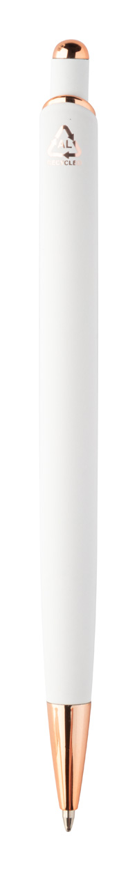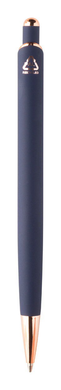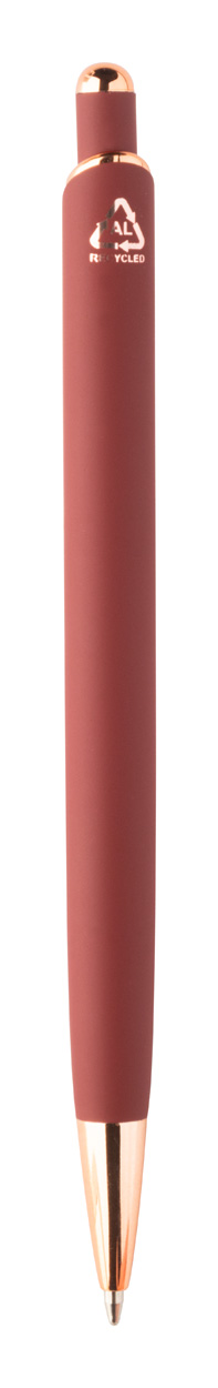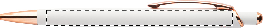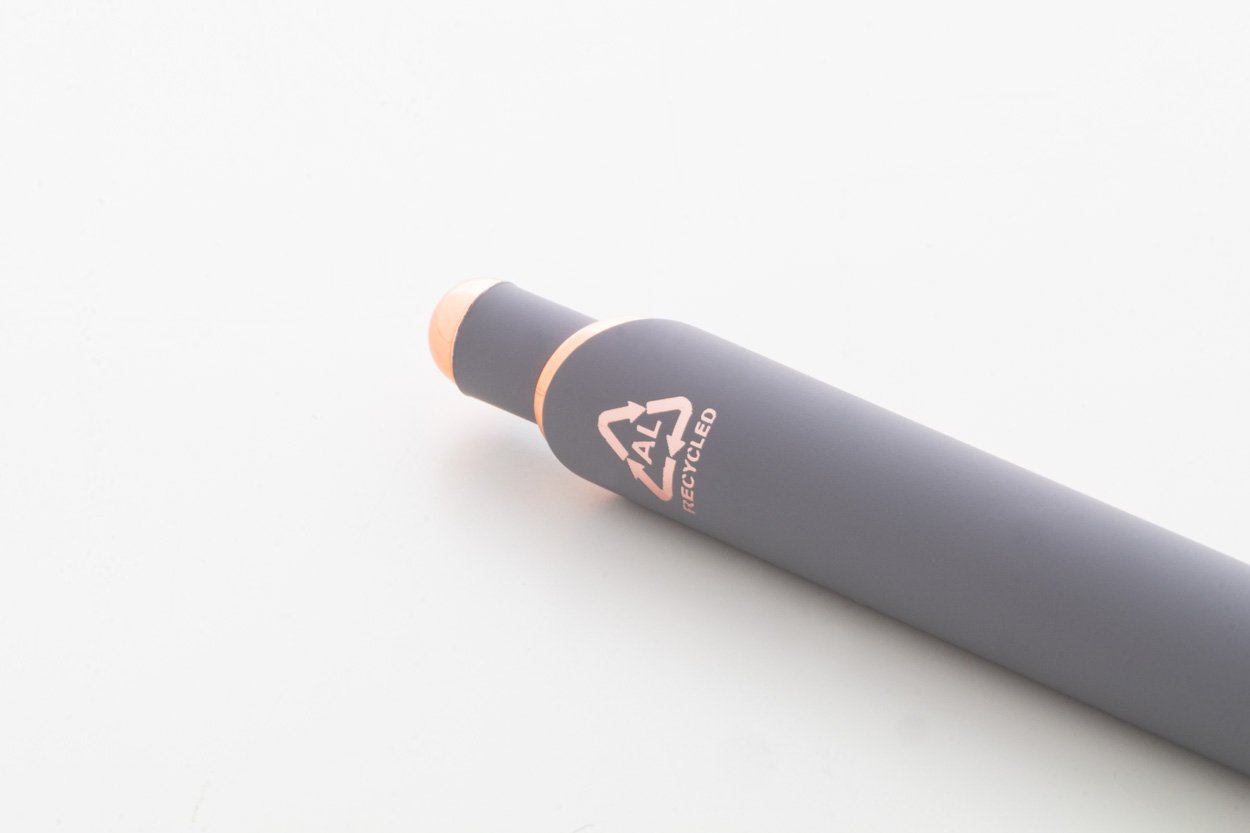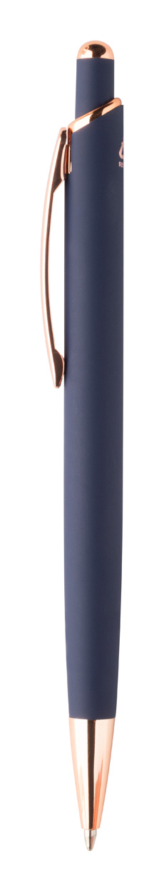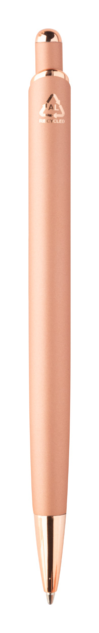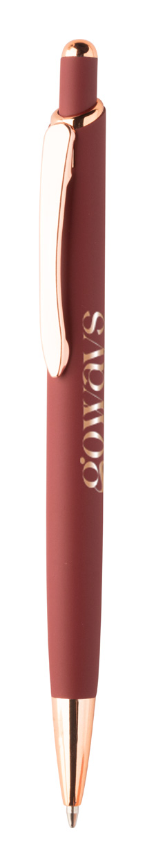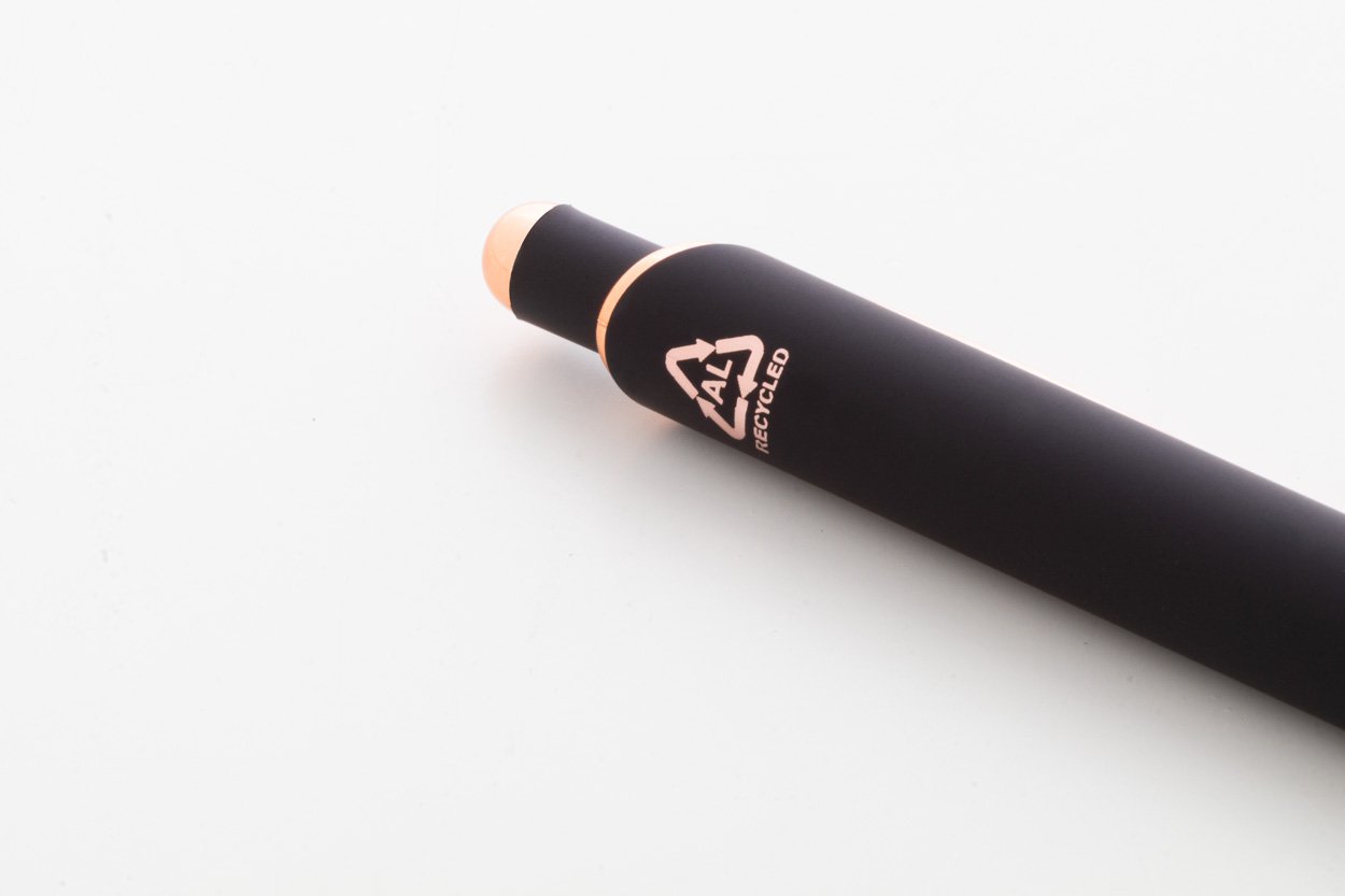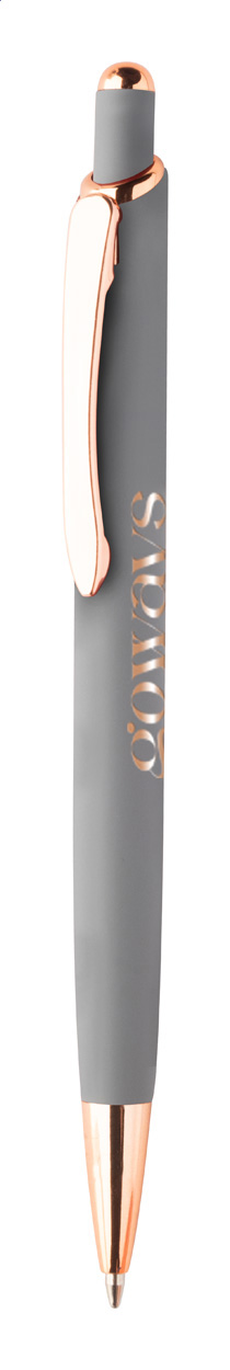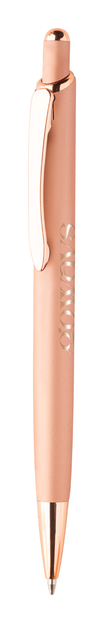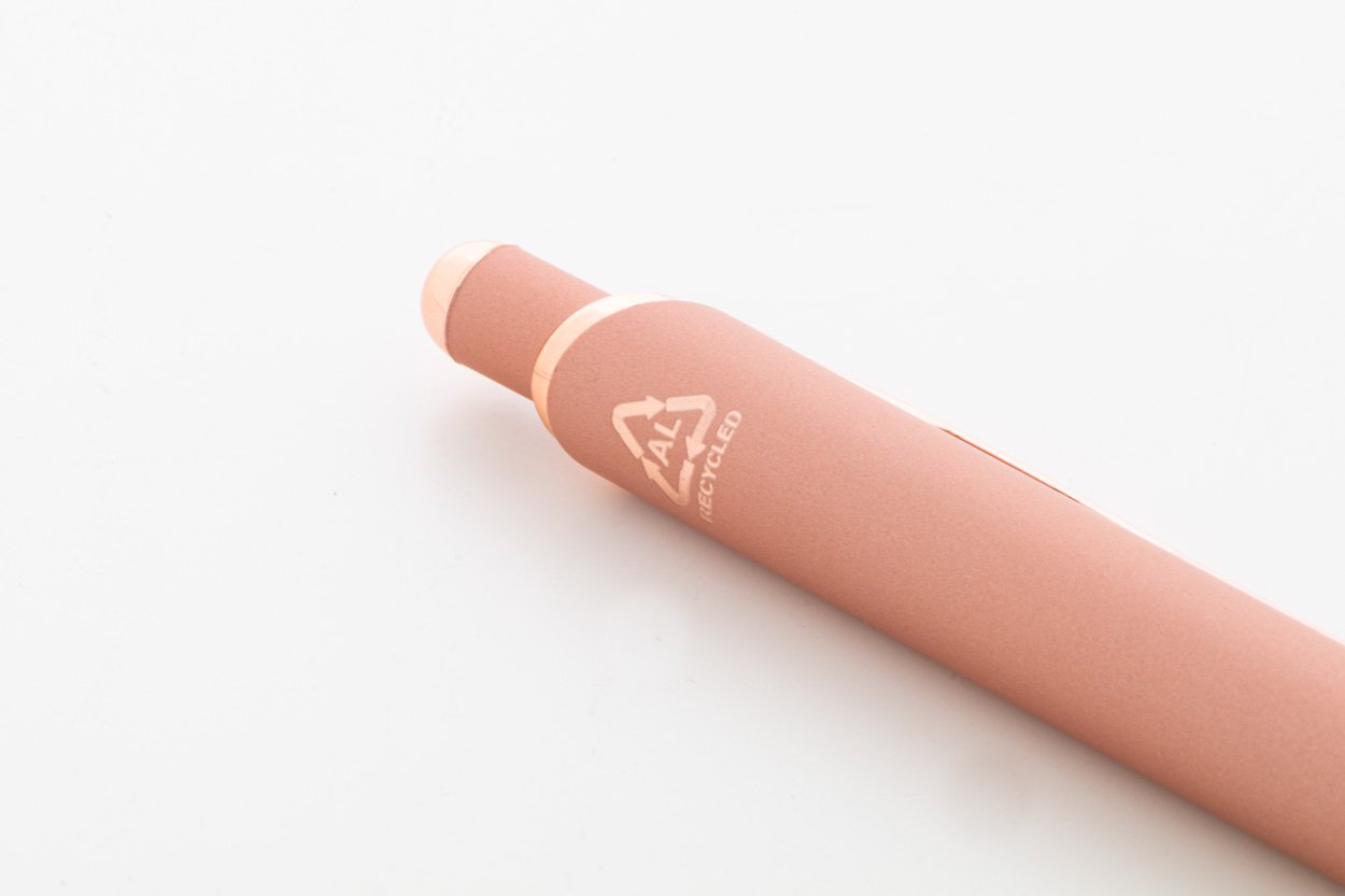 Penna a sfera in alluminio, dettagli in color oro rosa, refill blu e rivestimento gommato speciale per incisione laser a specchio in colore oro rosa.