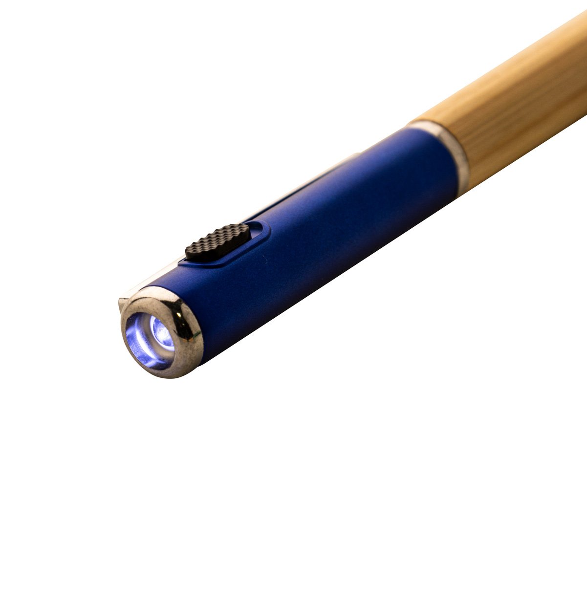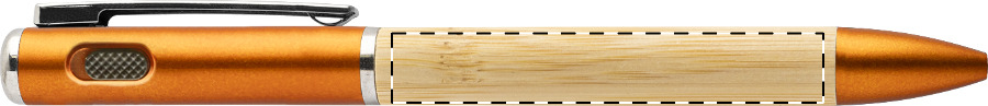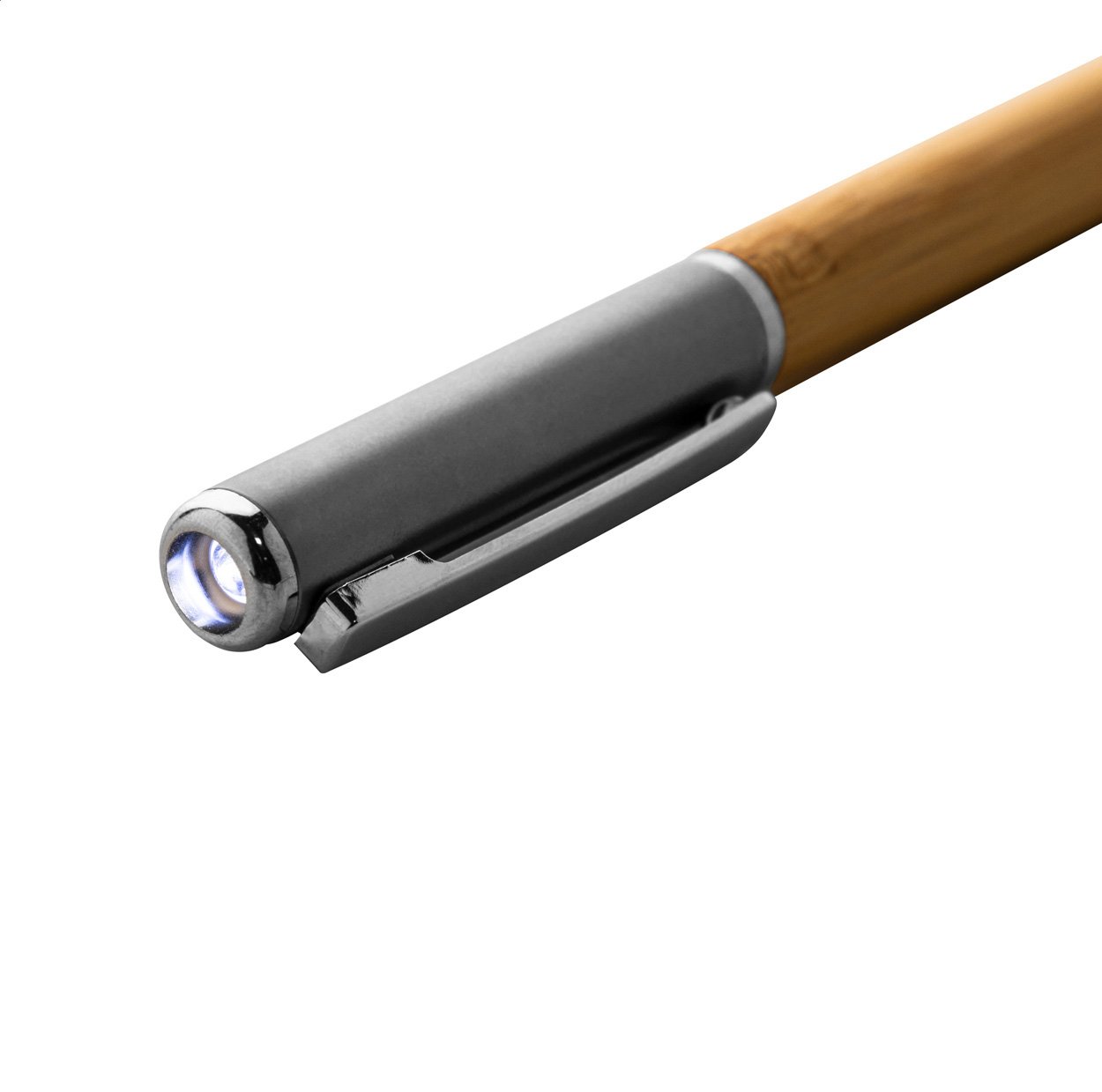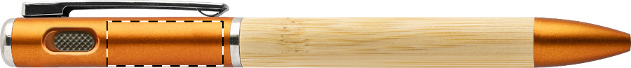 Penna a sfera in bambù e plastica ABS riciclata, meccanismo di apertura a rotazione, 1 torcia LED, refill blu e batteria a bottone.