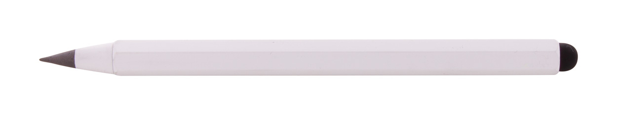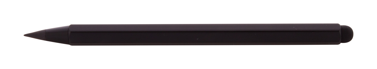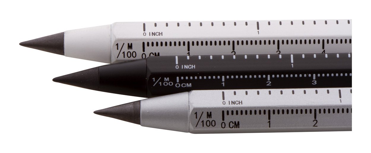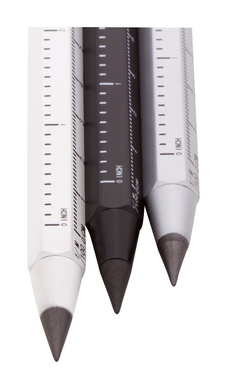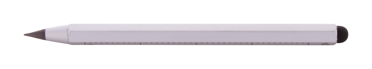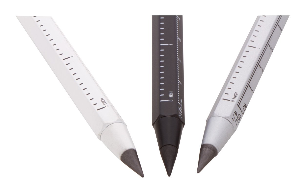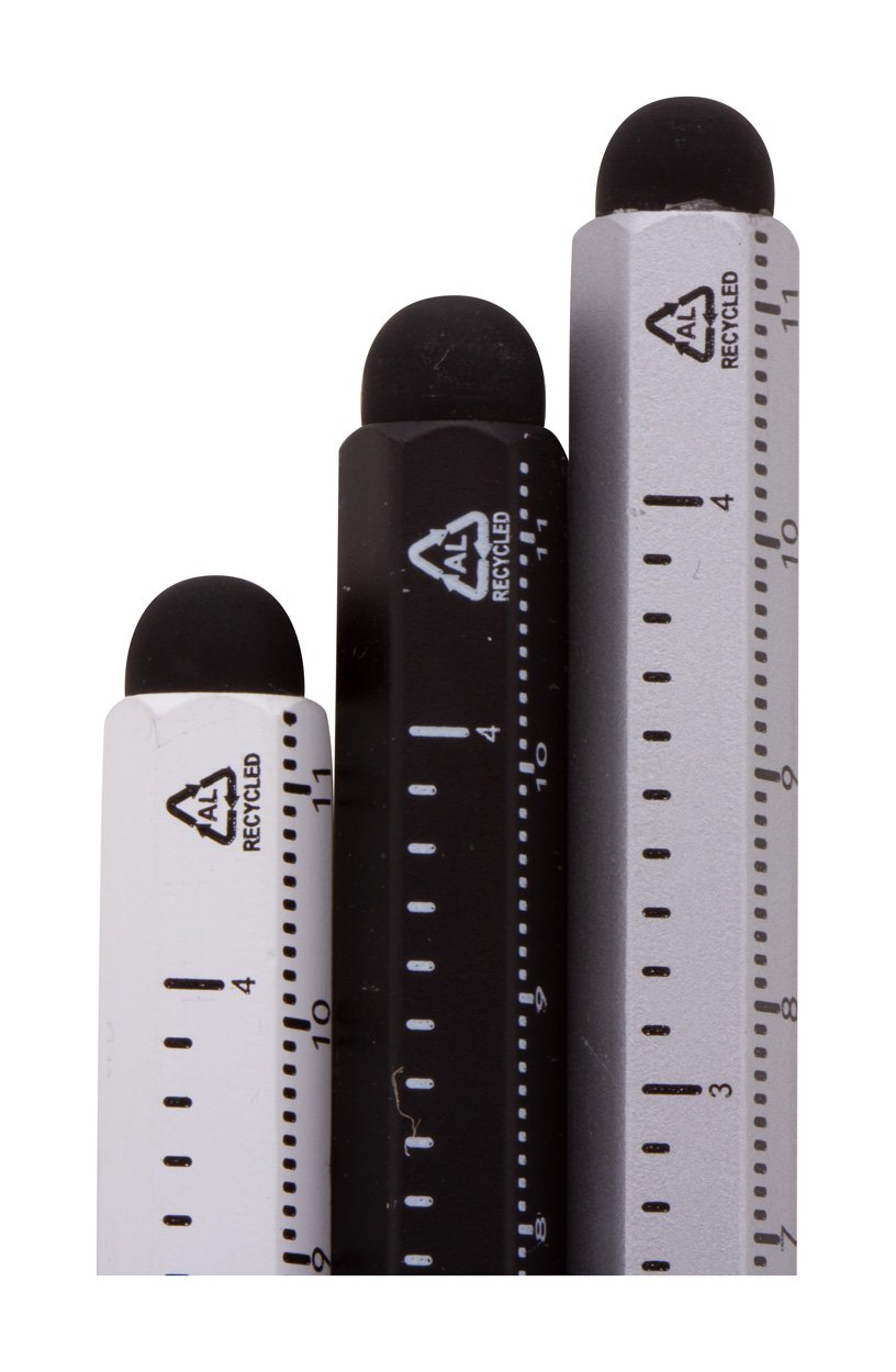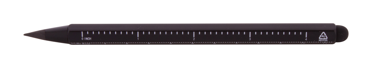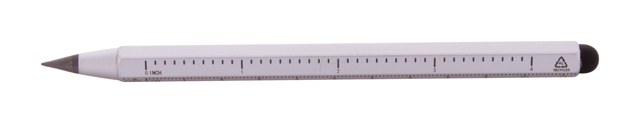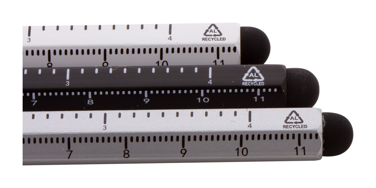 Penna in alluminio riciclato senza inchiostro di lunga durata con punta in lega metallica che ossida la carta e gommino capacitivo. Con fusto esagonale che integra righello da 11 cm e da 4 pollici. Questa penna scrive come una matita ed è anche cancellabile.