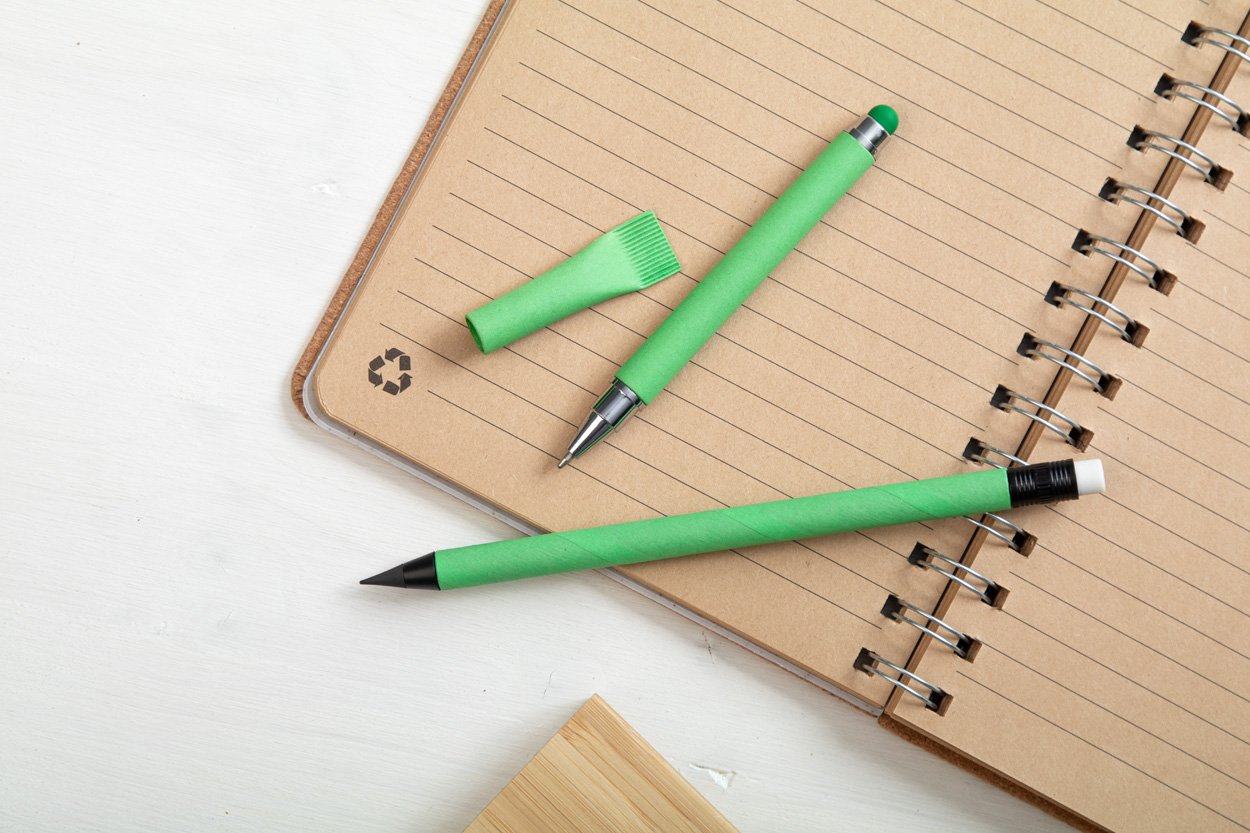 Penna senza inchiostro di lunga durata in carta riciclata con dettagli e gomma neri. Dotata di punta in lega metallica che ossida la carta scrivendo in modo simile a una matita ed è anche cancellabile.