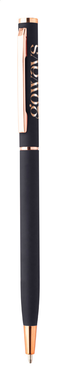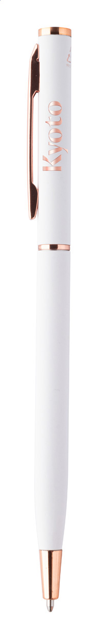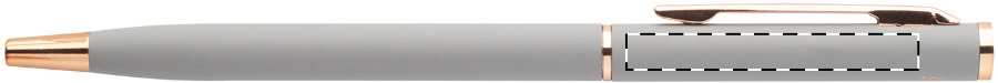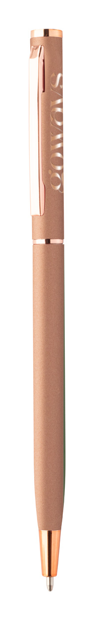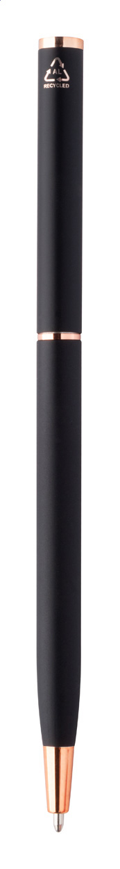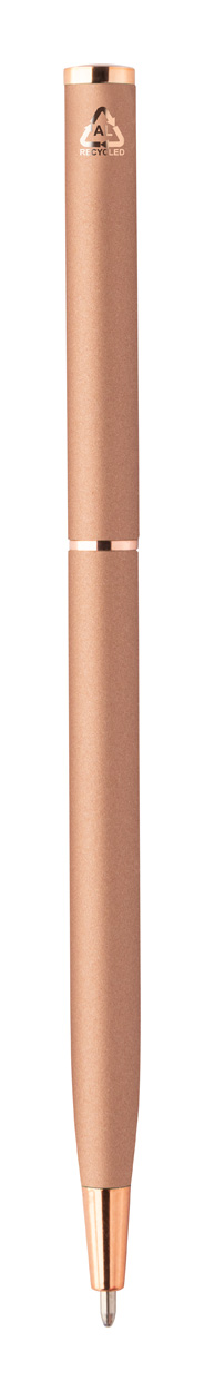 Penna a sfera in alluminio riciclato con meccanismo a rotazione, dettagli in color oro rosa, refill blu e rivestimento gommato speciale per incisione laser a specchio in colore oro rosa.