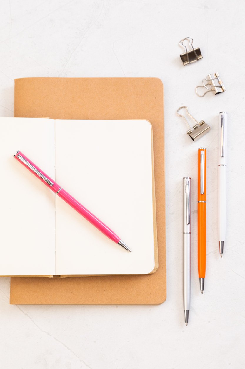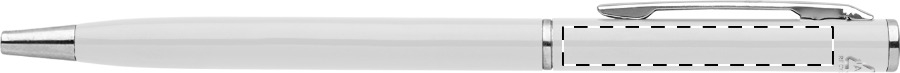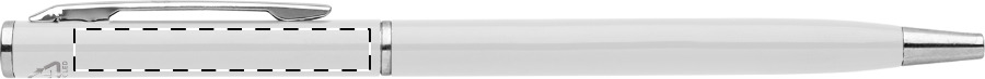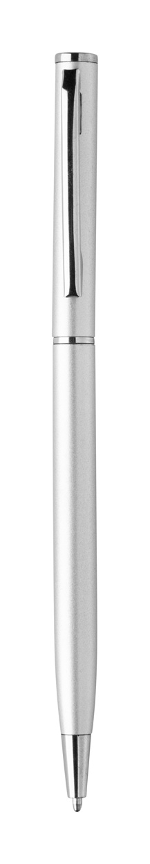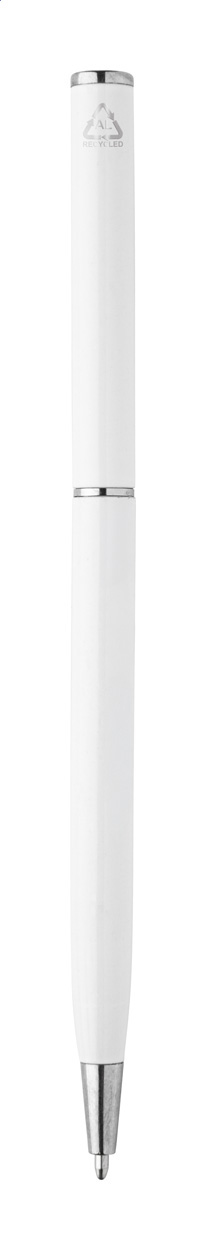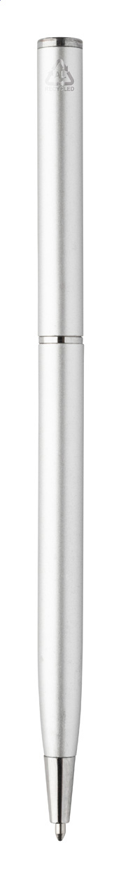 Penna a sfera in alluminio riciclato con meccanismo di apertura a rotazione e componenti cromate. Fornita con refill blu.