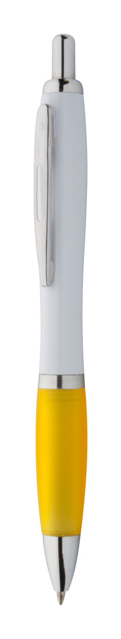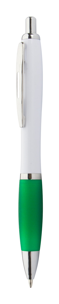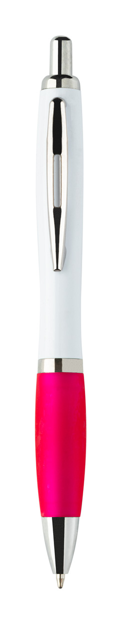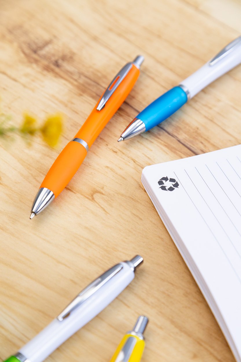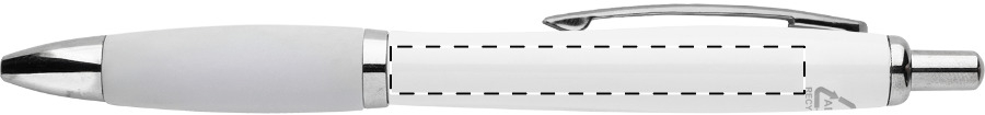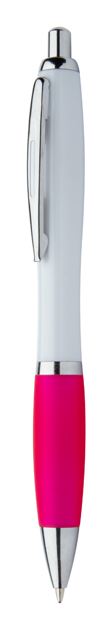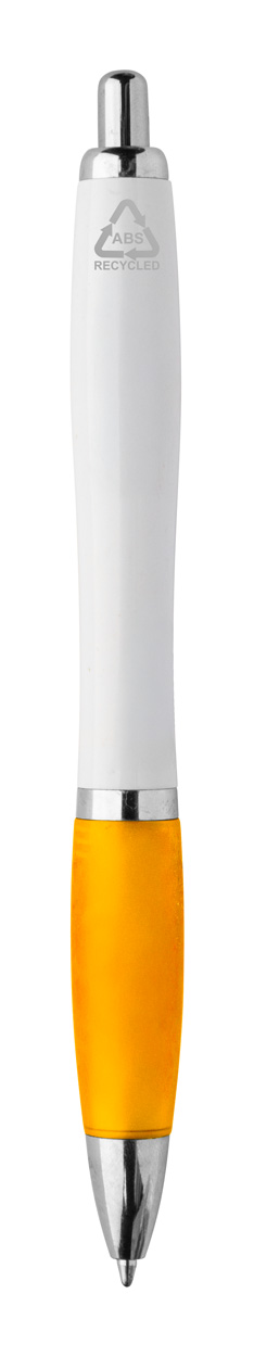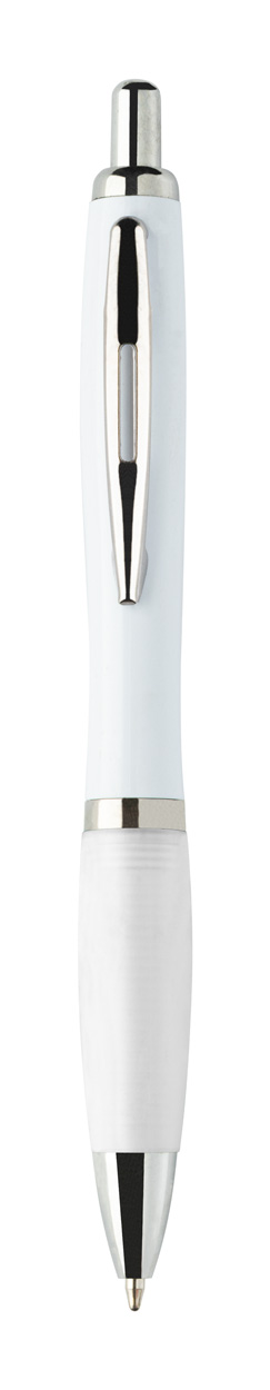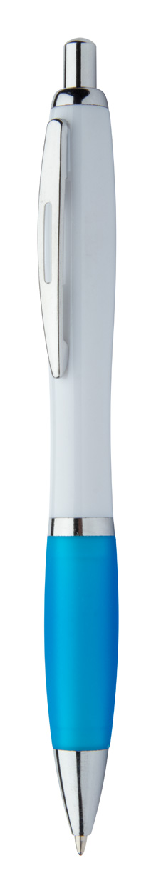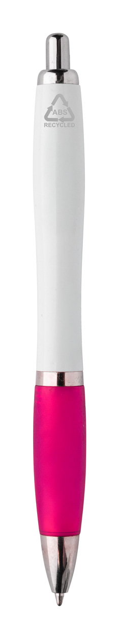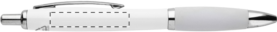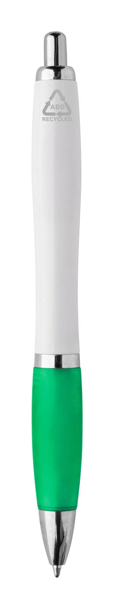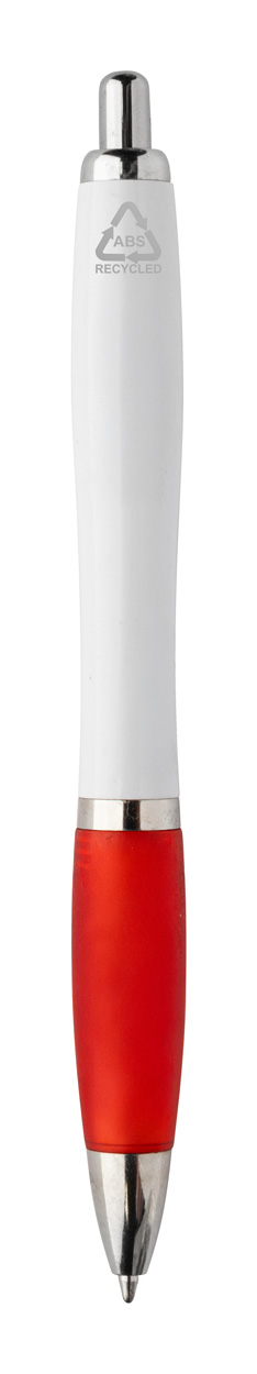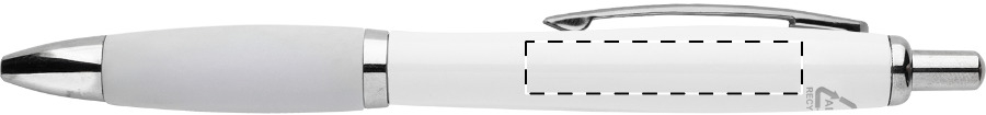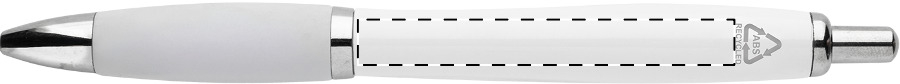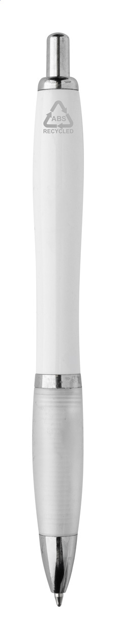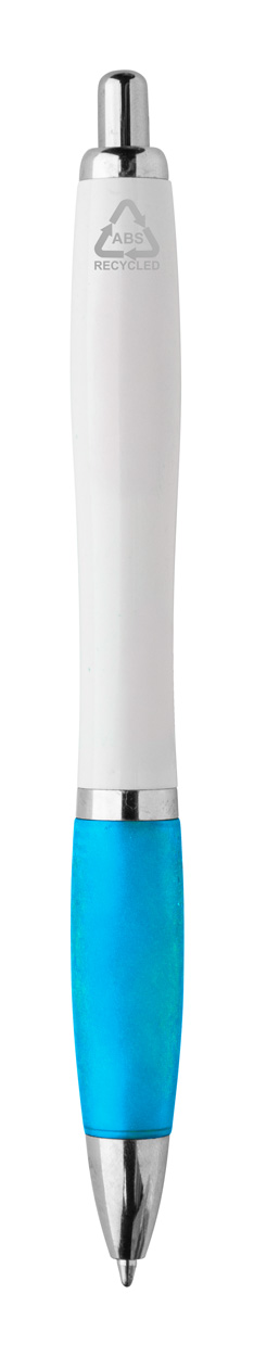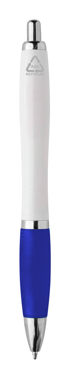 Penna a sfera in plastica ABS riciclata con refill blu, fusto bianco, impugnatura colorata e parti cromate.