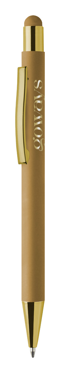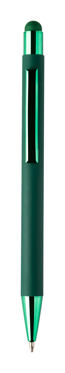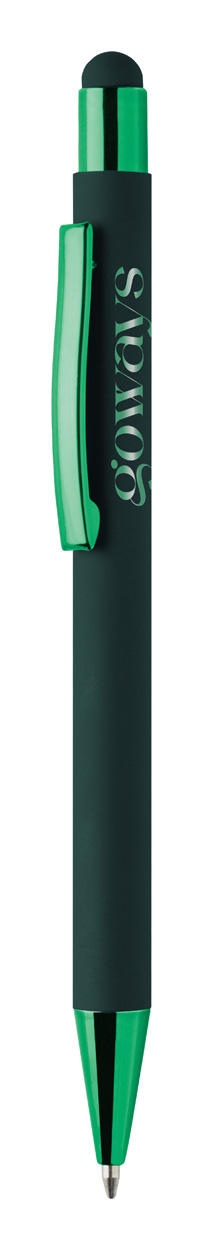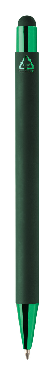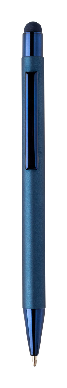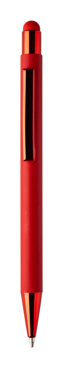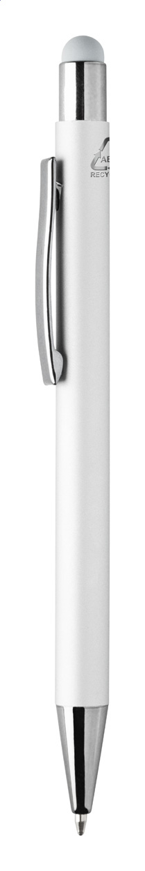 Penna a sfera capacitiva in alluminio riciclato con refill blu, fusto gommato e parti con finitura colorata metallizzata lucida. Lo speciale rivestimento permette l'incisione a specchio coordinata con le parti metalliche.