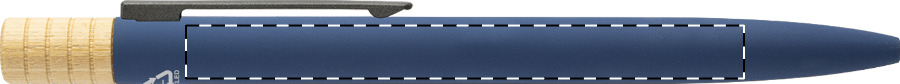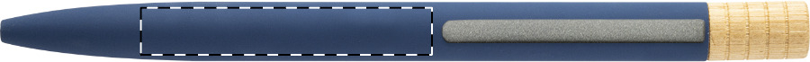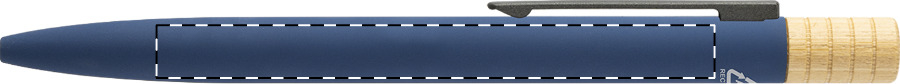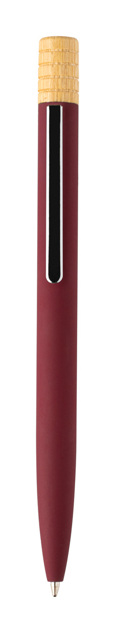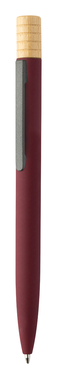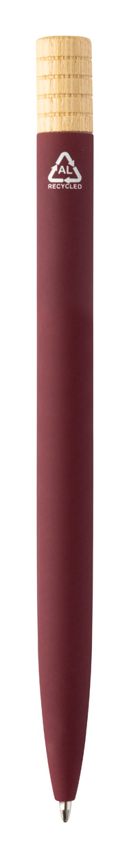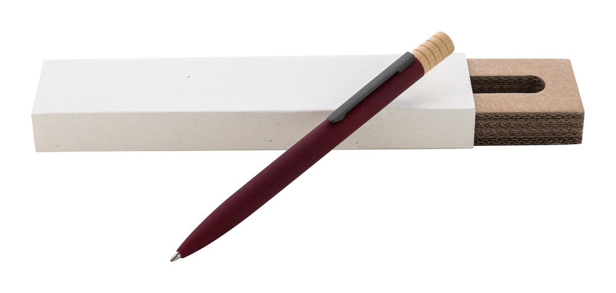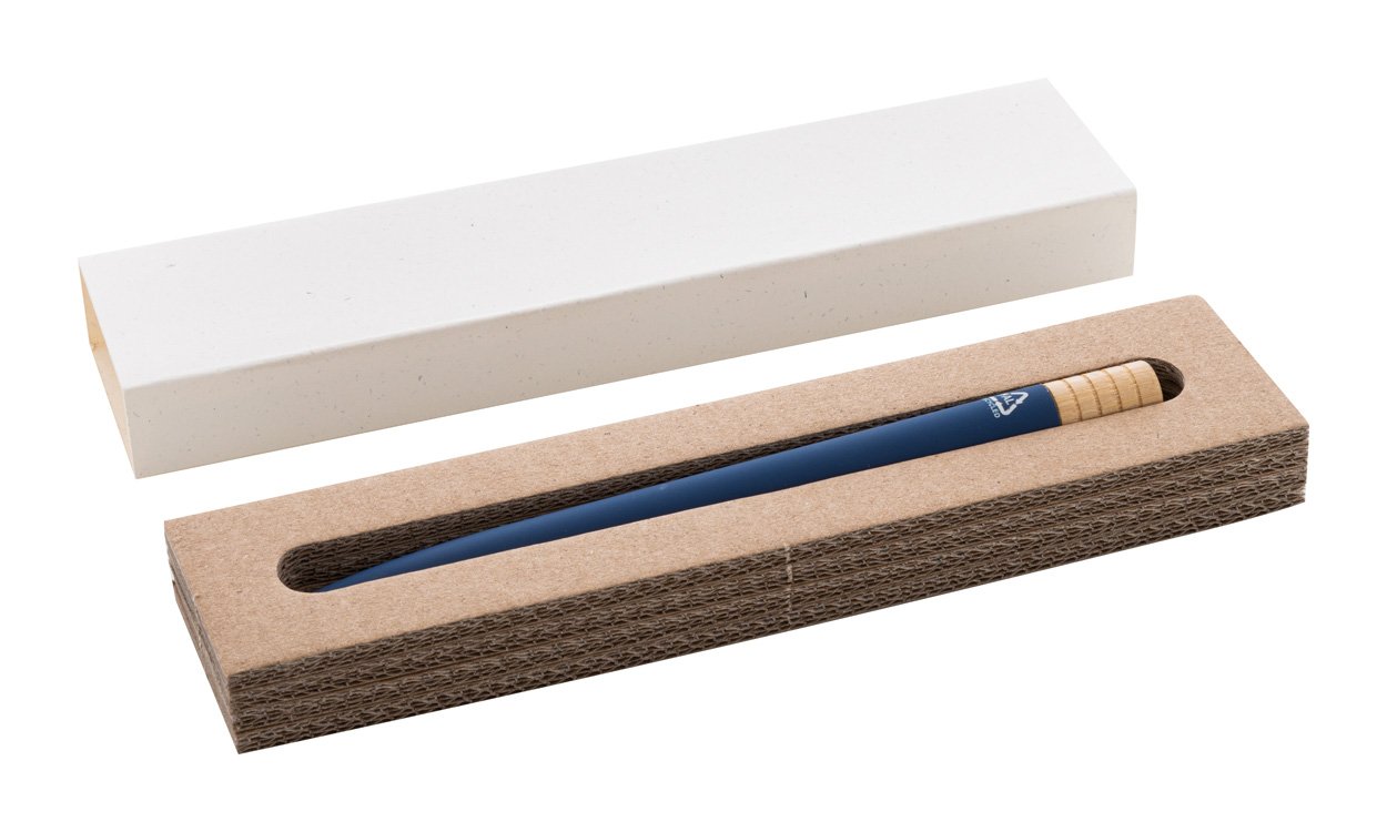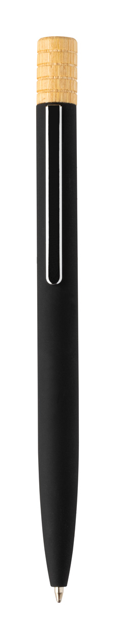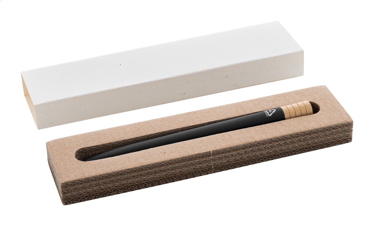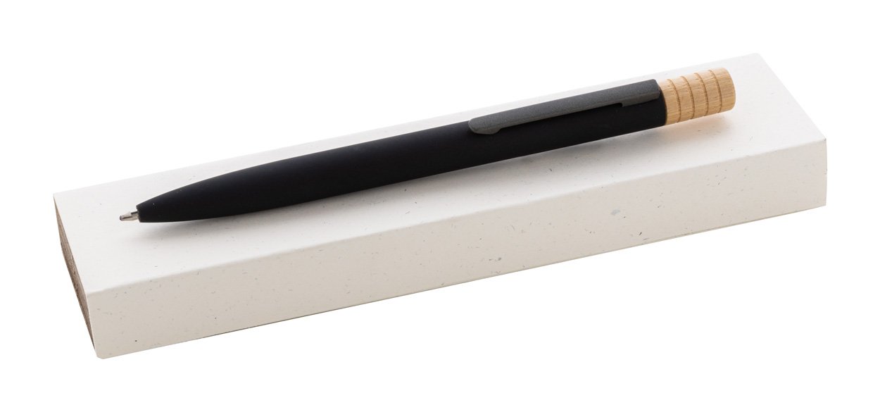 Penna a sfera in alluminio riciclato, meccanismo di apertura a rotazione, fusto gommato, componenti con finitura color canna di fucile e cappuccio in bamboo. Fornita con refill blu ed astuccio in cartoncino kraft
