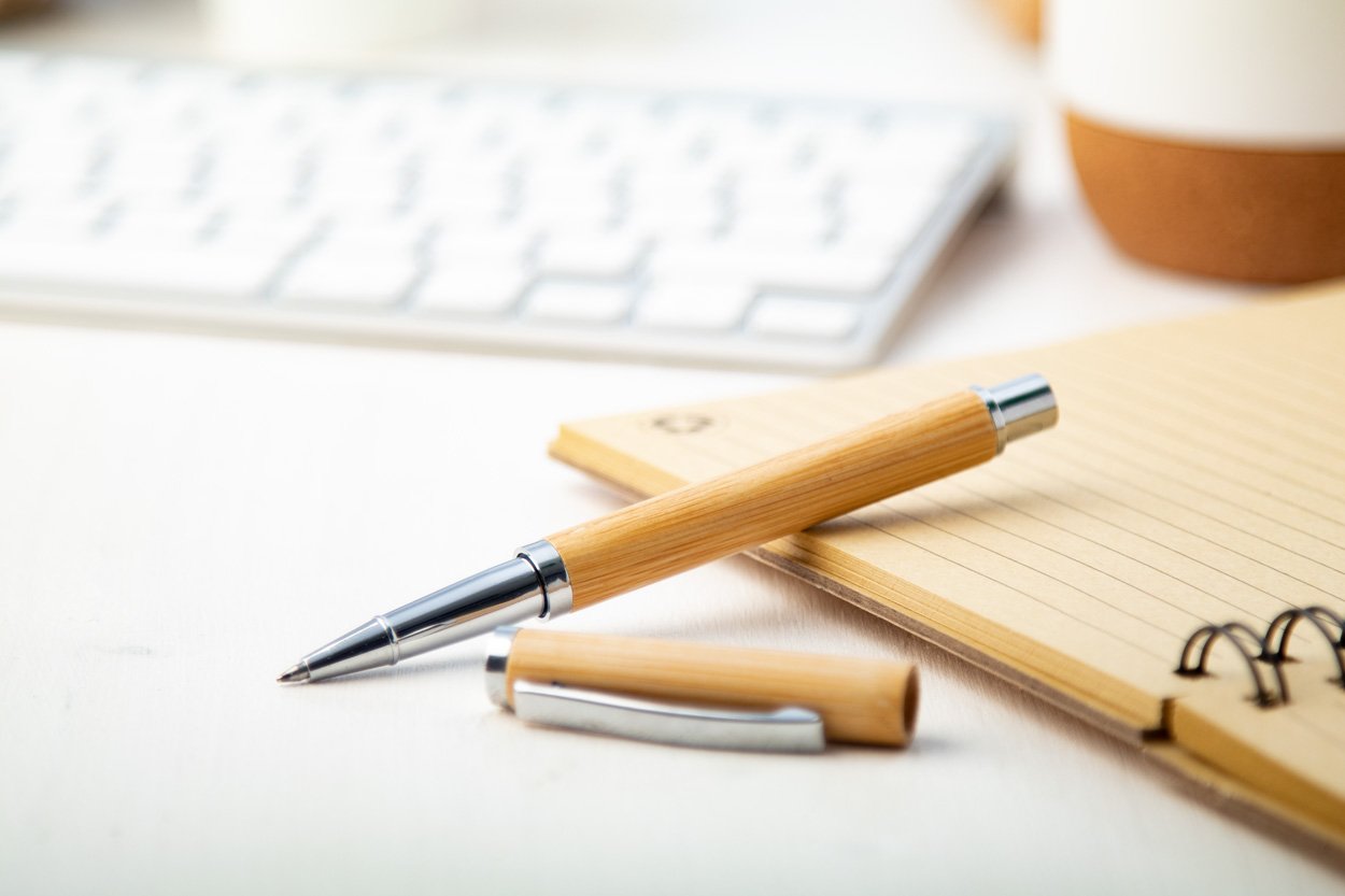 Penna roller in bambù con refill blu.