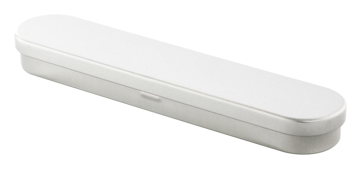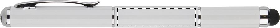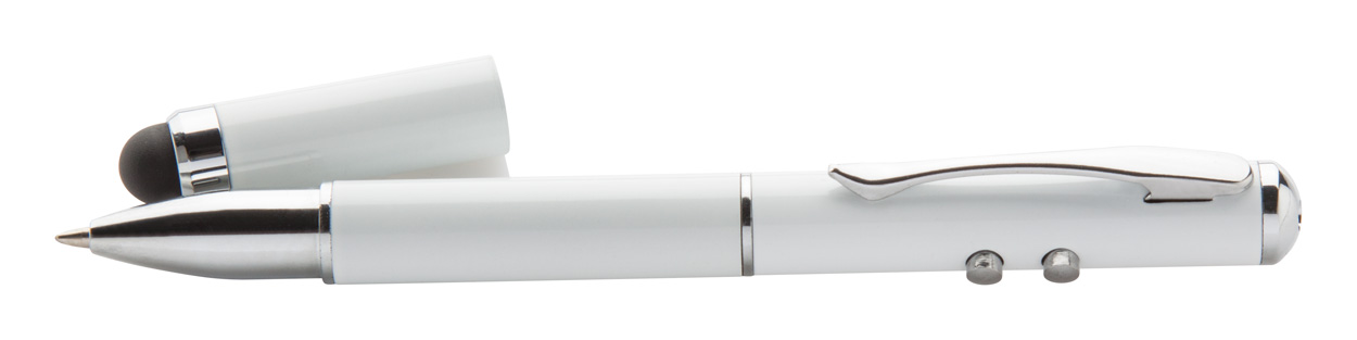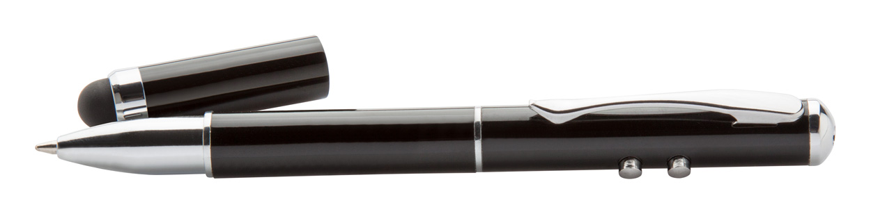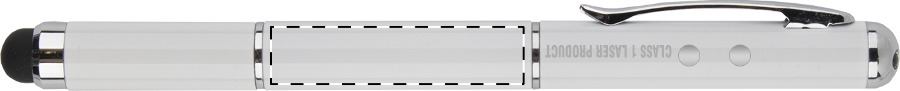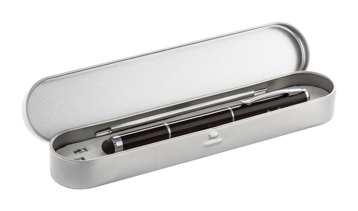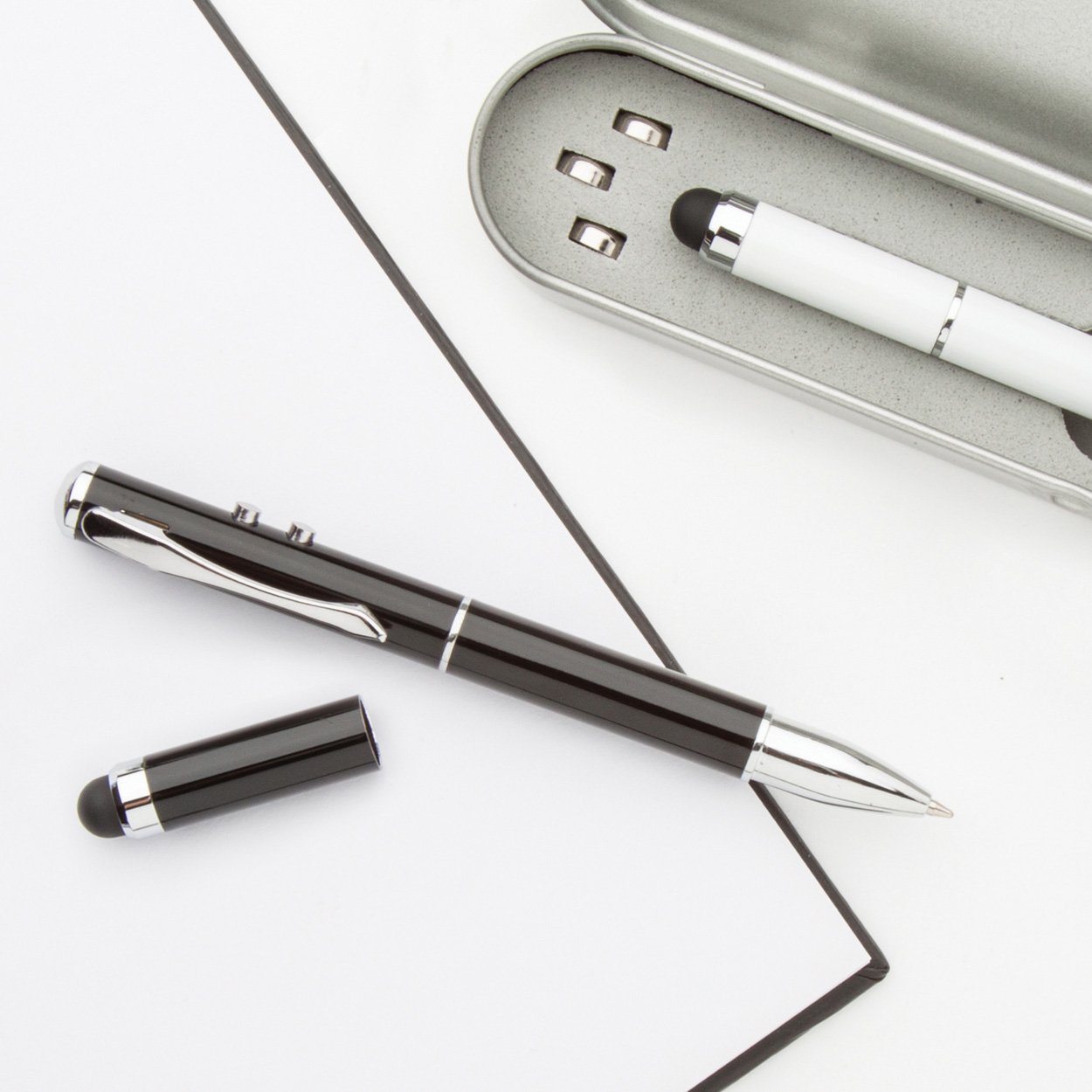 Puntatore laser multifunzione con penna a sfera capacitiva e luce LED. Completo di elegante astuccio regalo in metallo con batterie a bottone e refill blu.