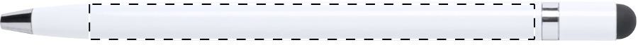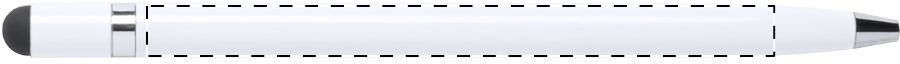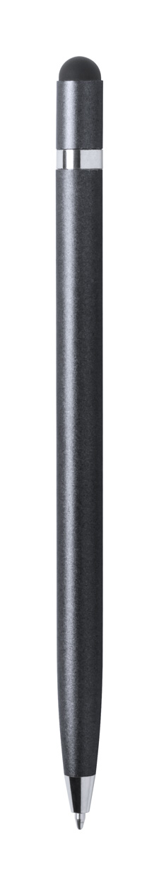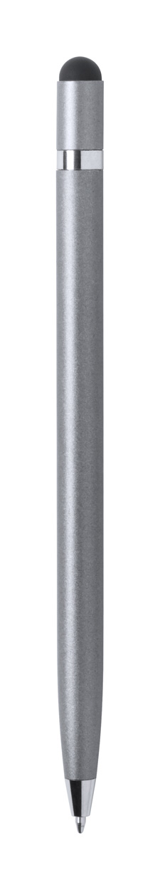 Penna a sfera in alluminio con meccanismo a rotazione, gommino capacitivo e refill blu.
