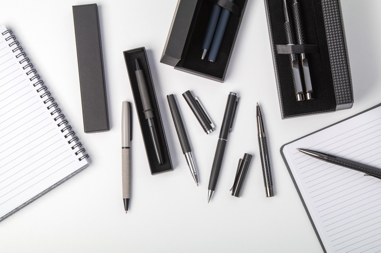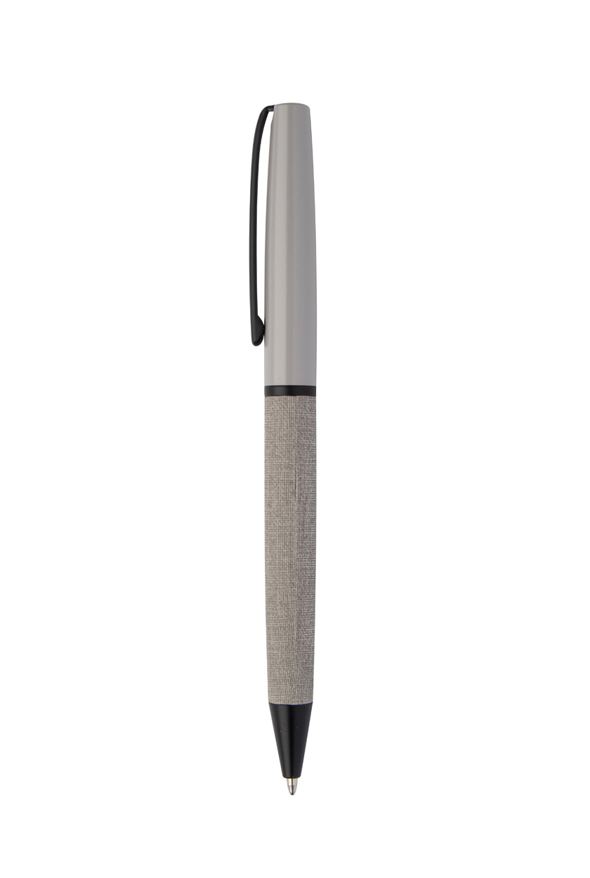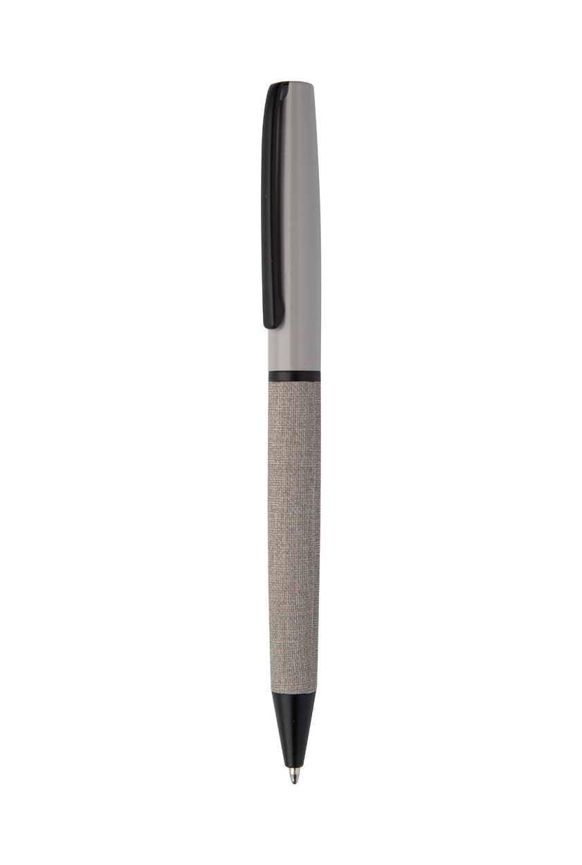 Elegante penna a sfera in metallo con meccanismo a rotazione, refill blu, fusto rivestito in pelle PU e parti nere. In confezione regalo nera.