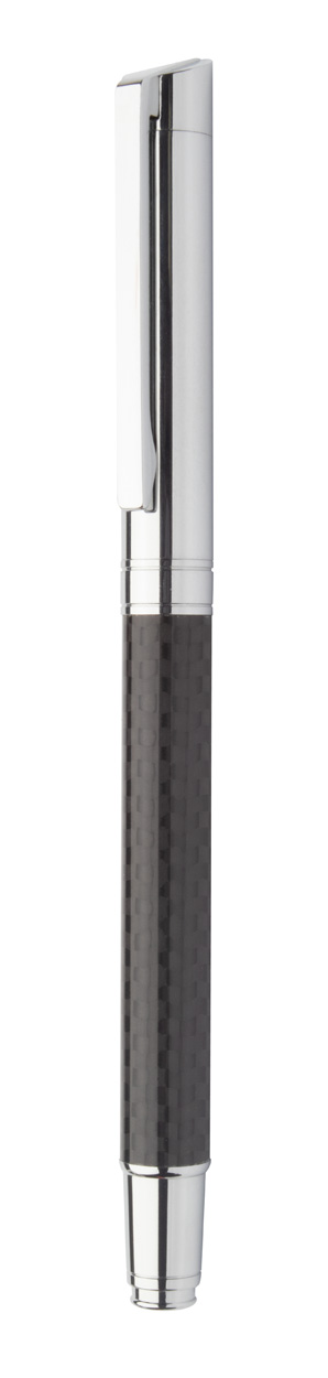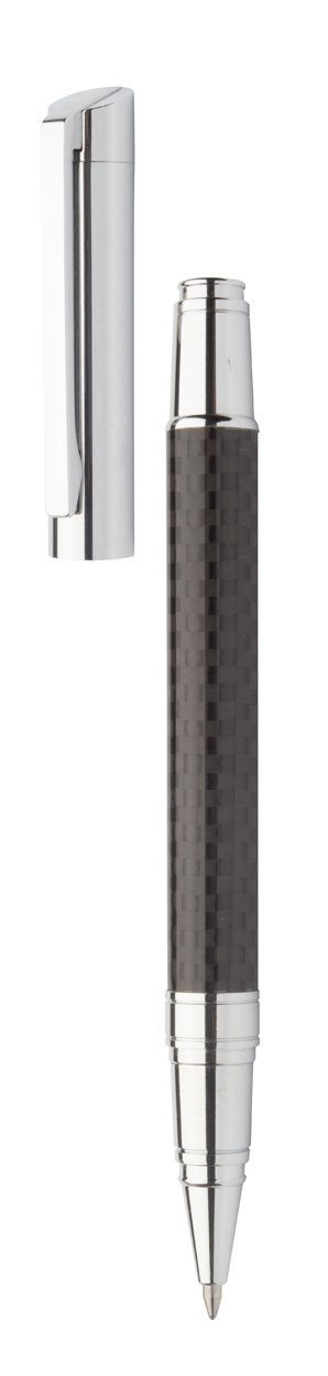 Elegante set composto da una penna a sfera ed una penna roller in metallo, fusto con finitura simil carbonio e parti cromate lucide. In confezione regalo nera e refill blu. Prodotto a marchio André Philippe.