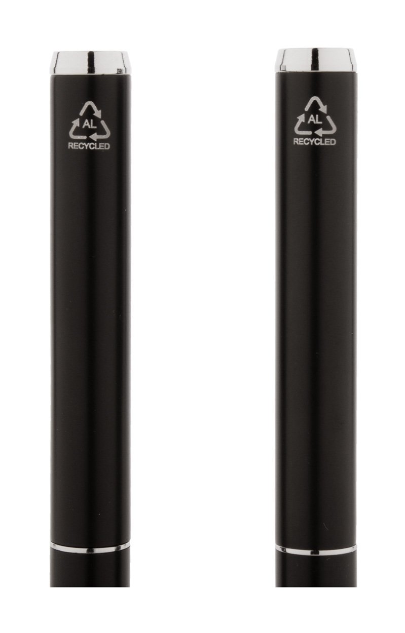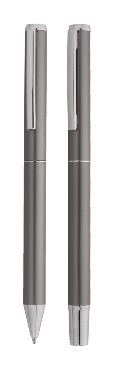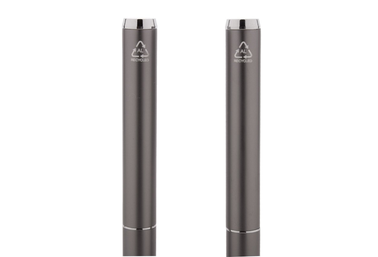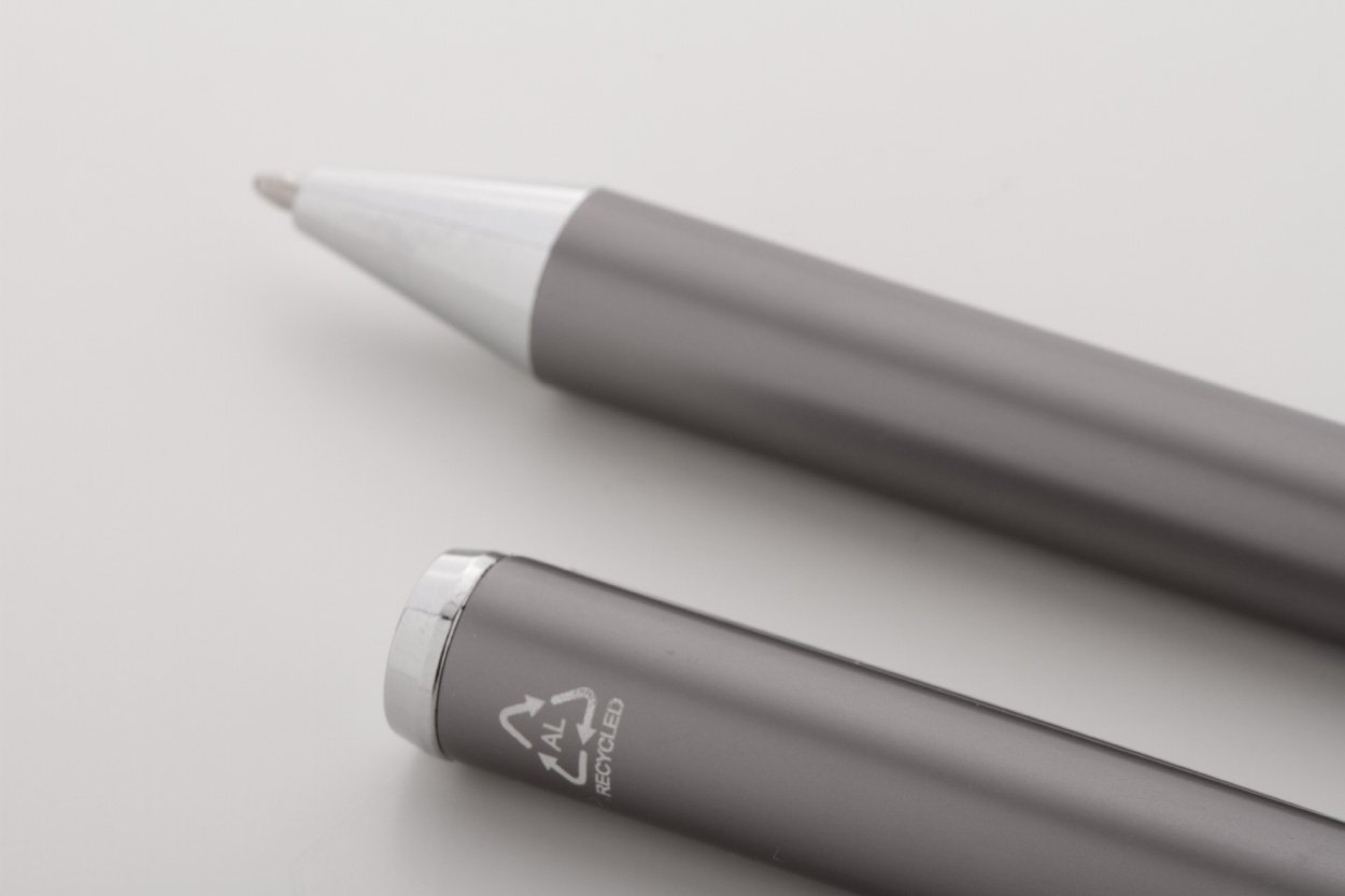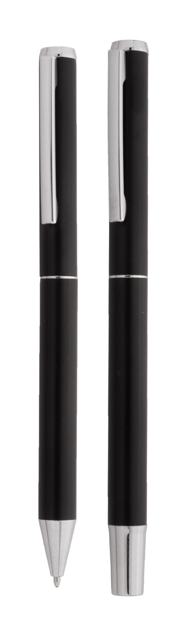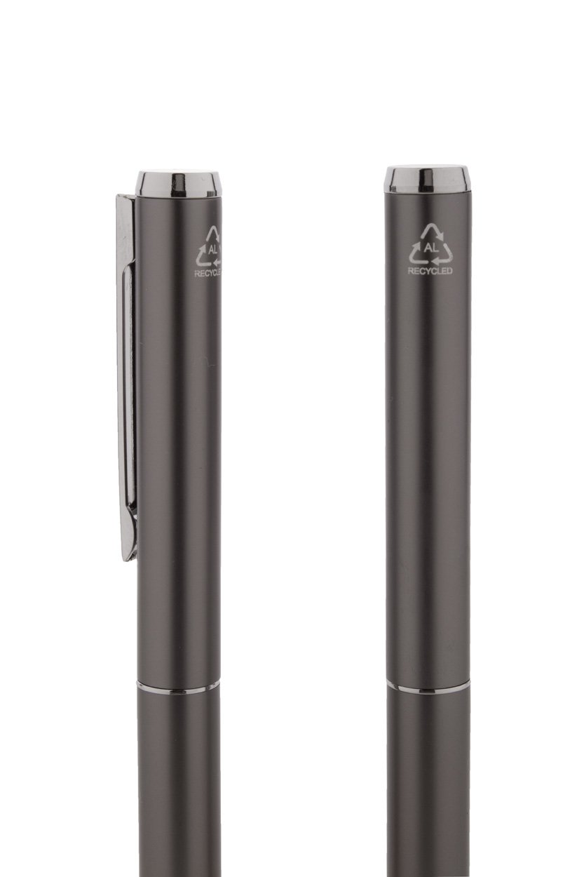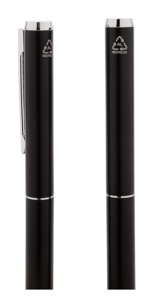Set di penne in alluminio riciclato composto da una penna roller ed una penna a sfera in confezione regalo di cartoncino nero. Con refill blu.