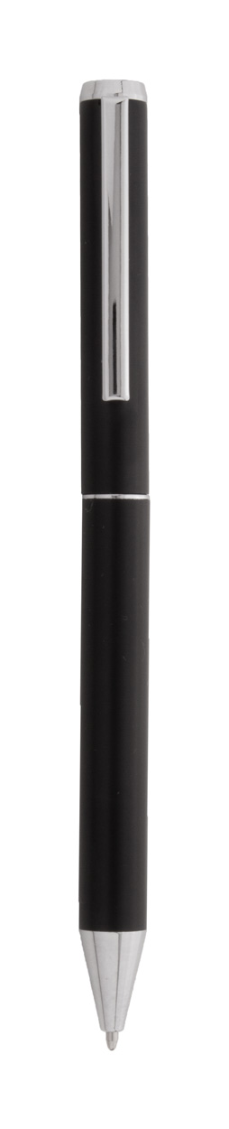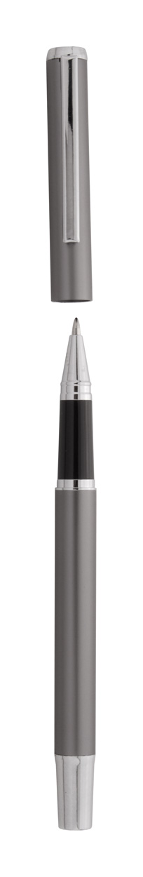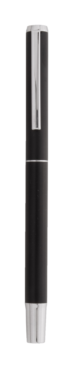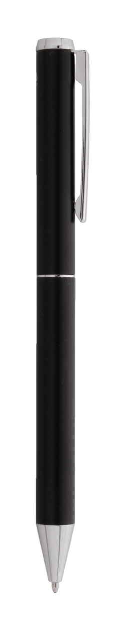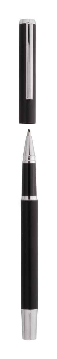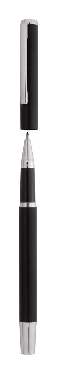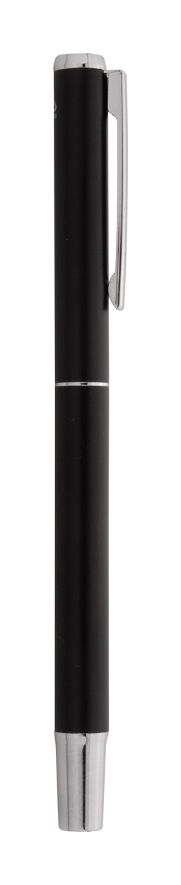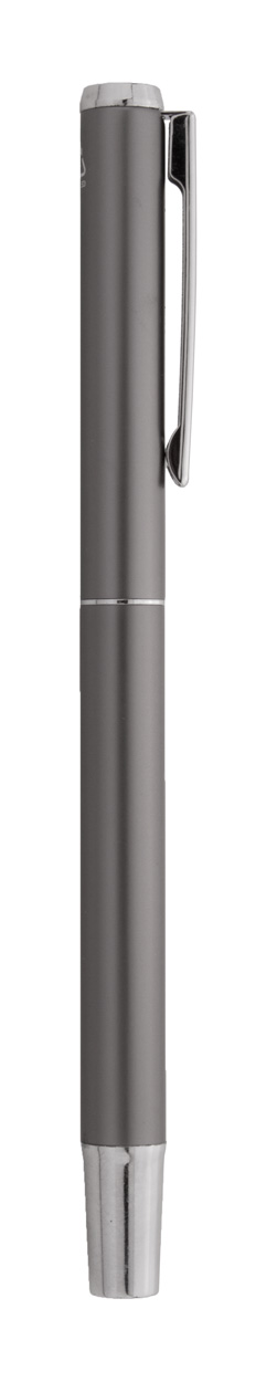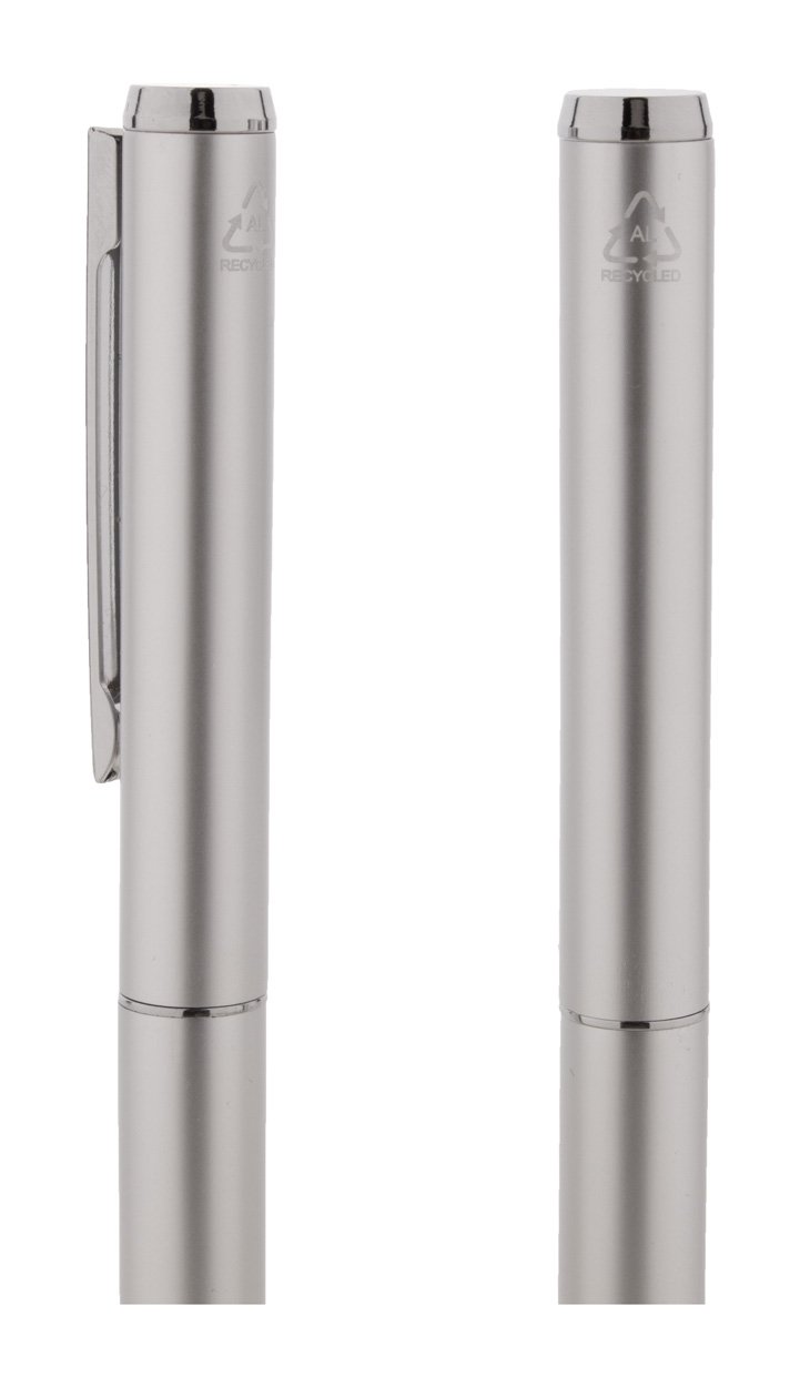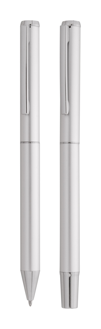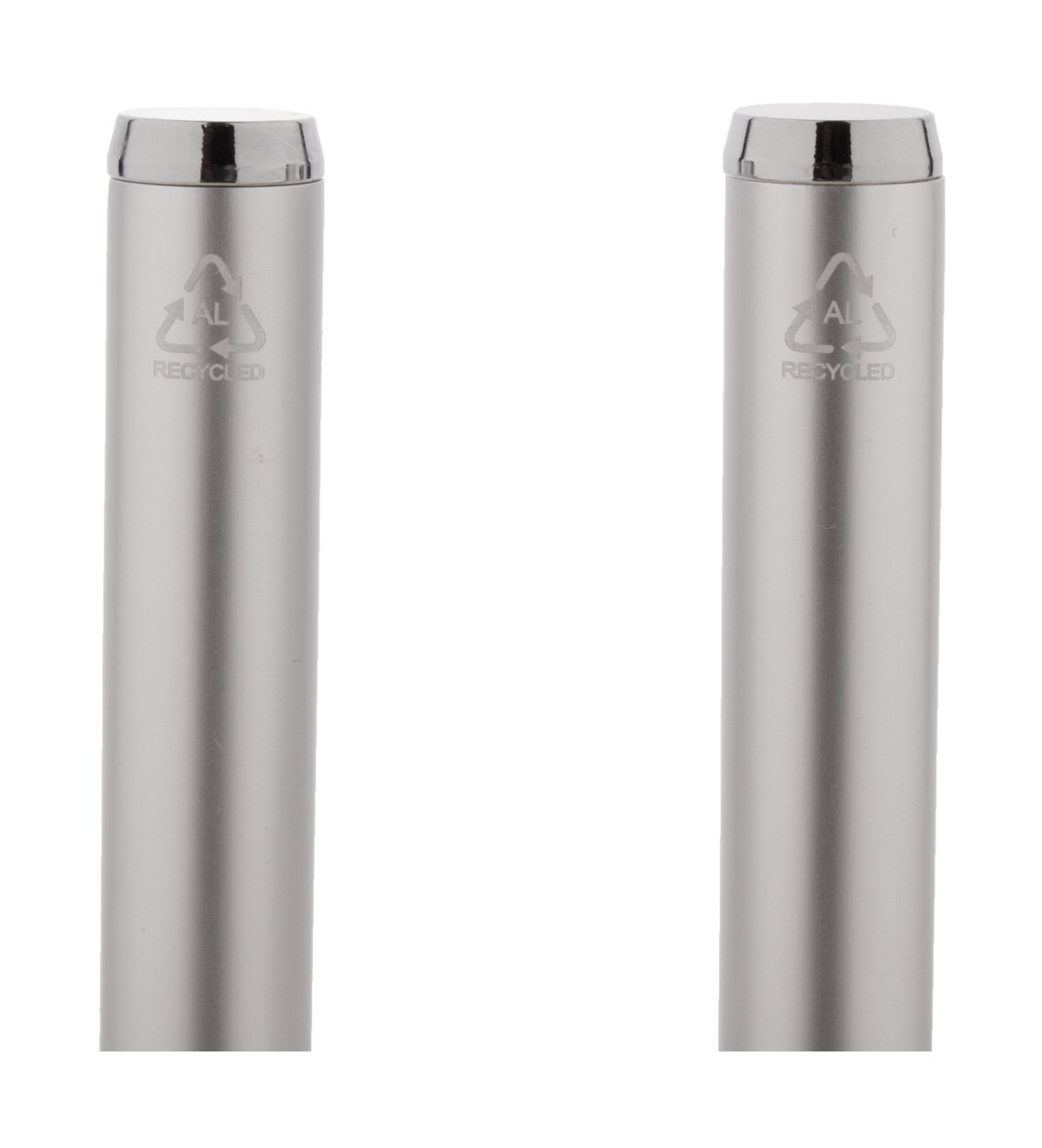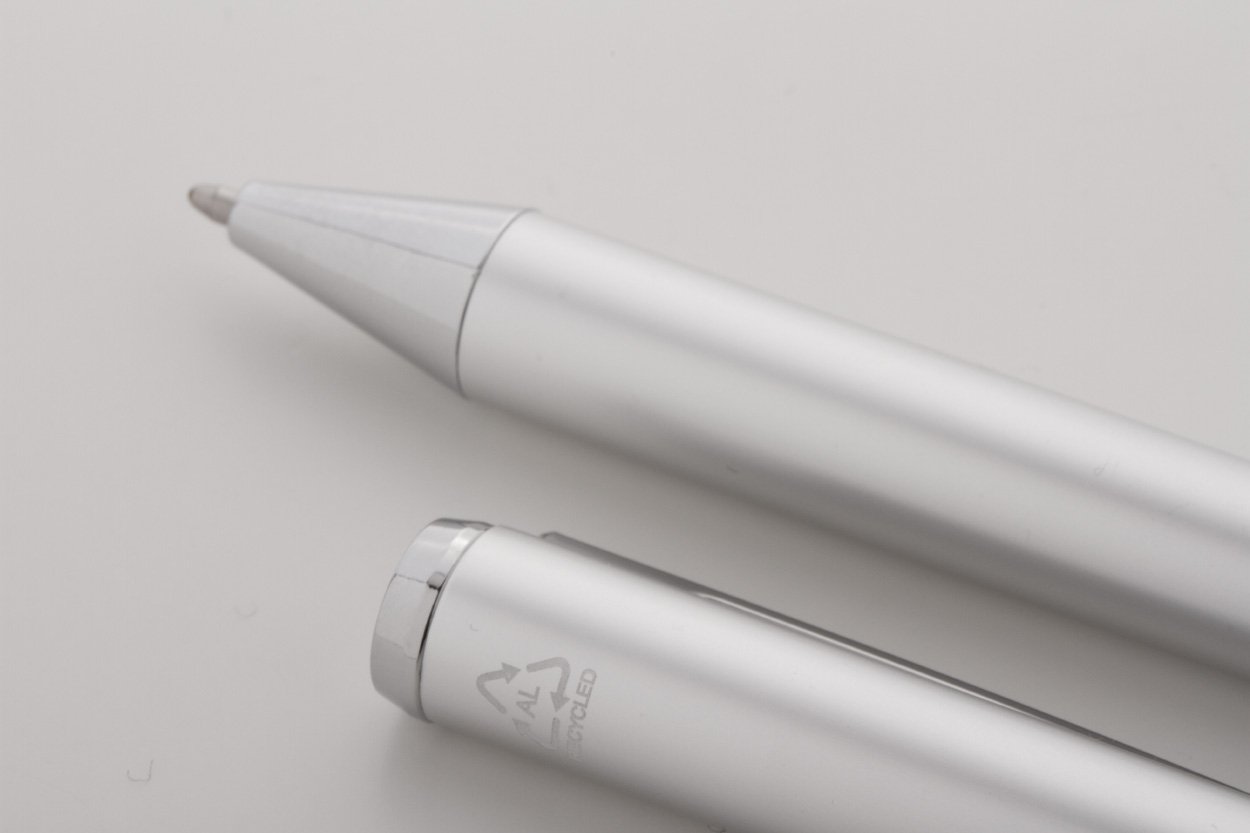 Set di penne in alluminio riciclato composto da una penna roller ed una penna a sfera in confezione regalo di cartoncino nero. Con refill blu.