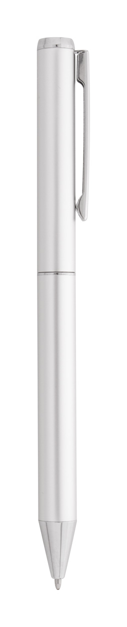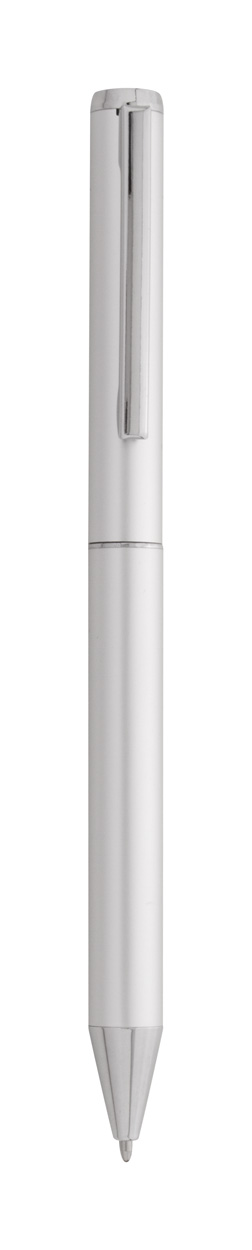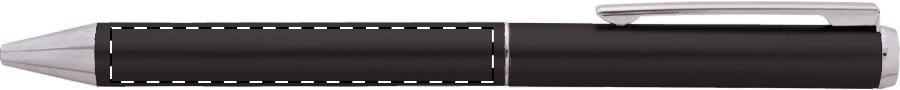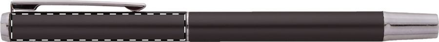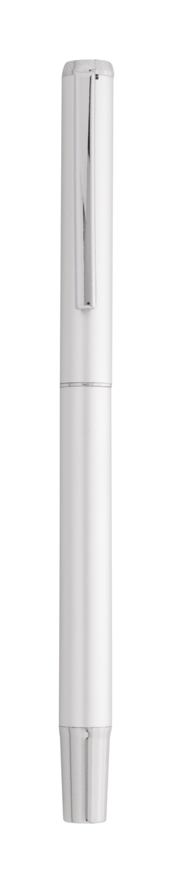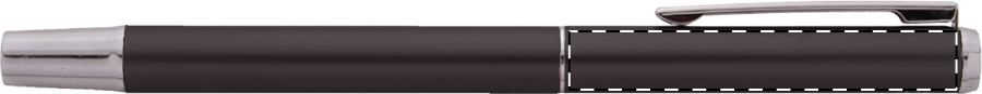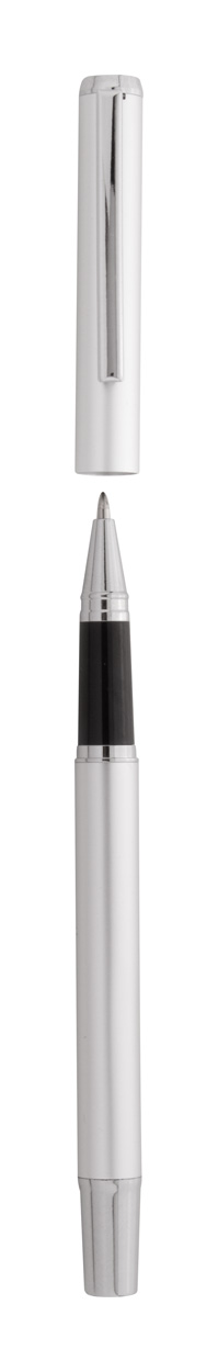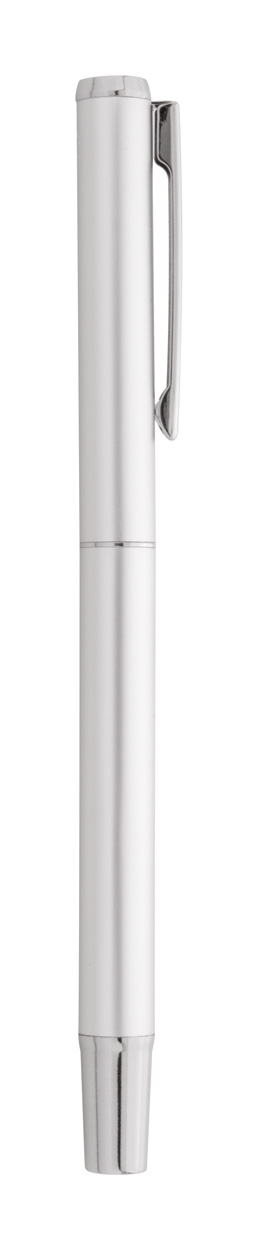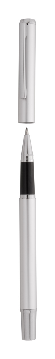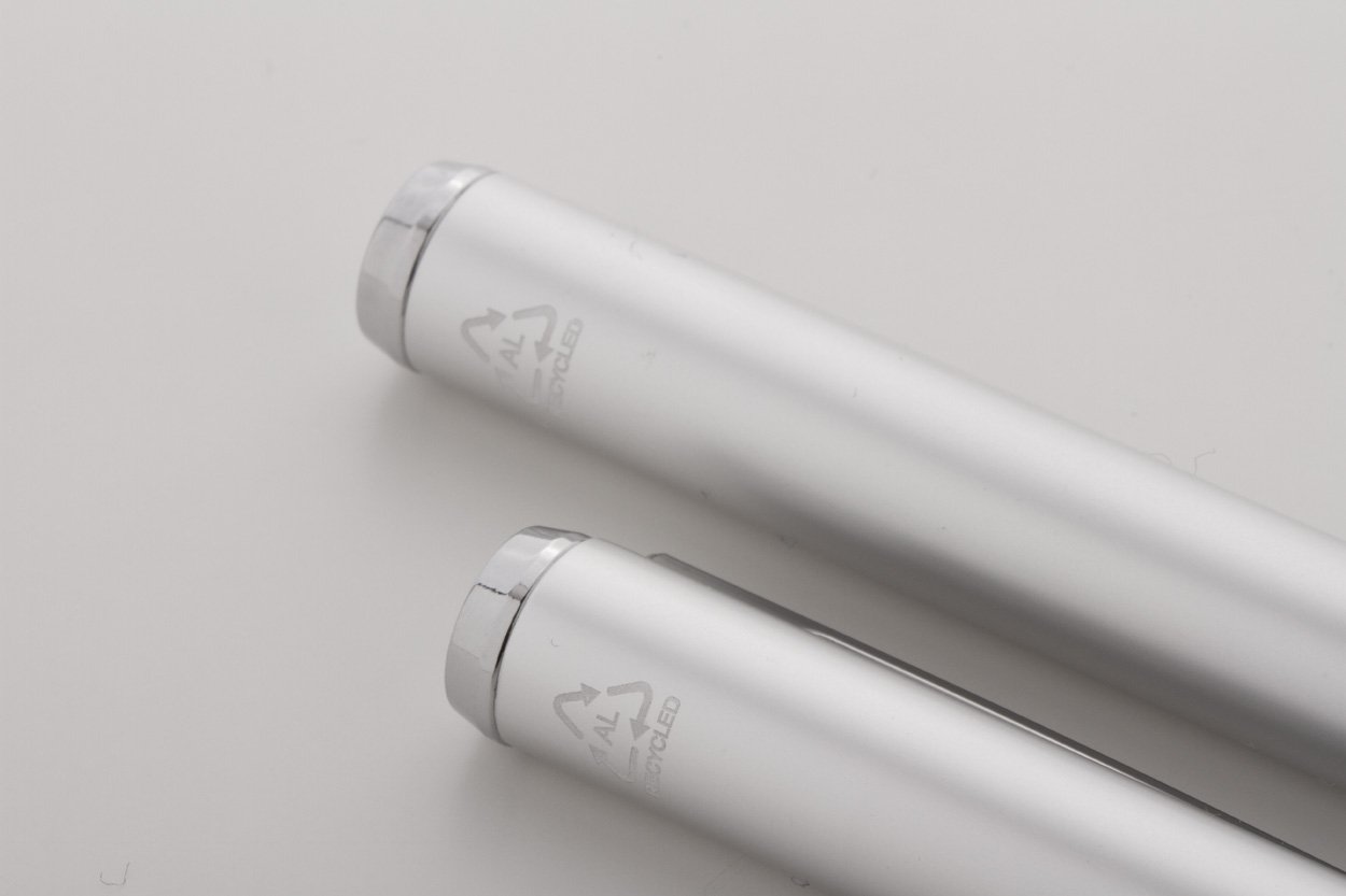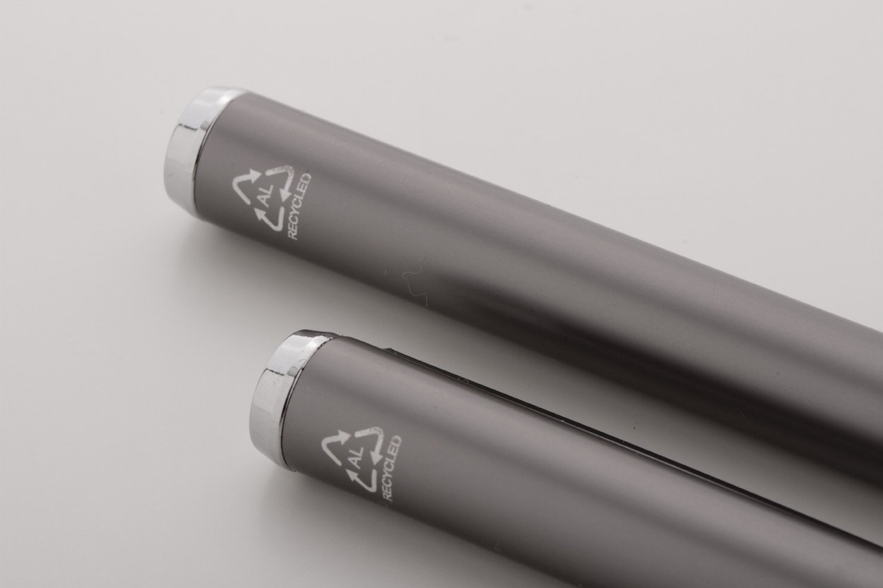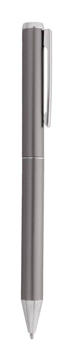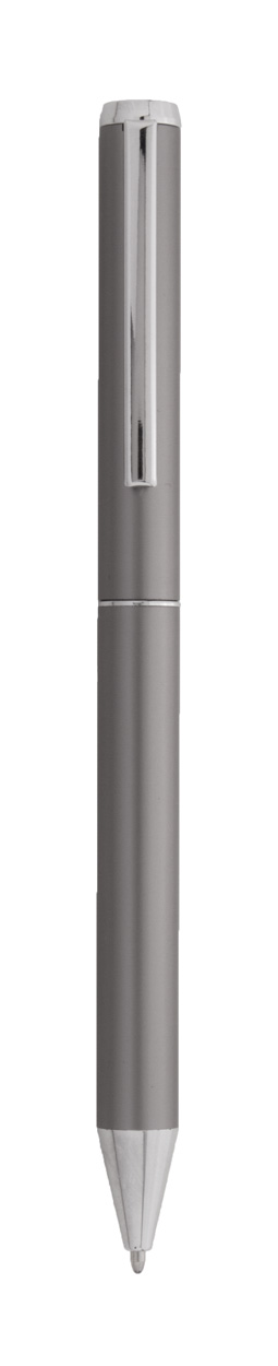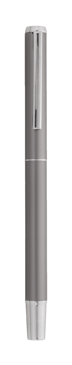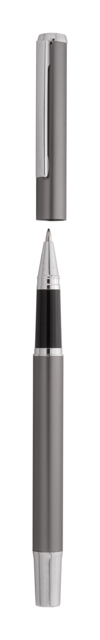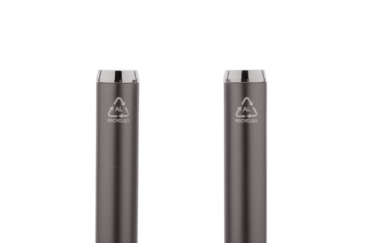 Set di penne in alluminio riciclato composto da una penna roller ed una penna a sfera in confezione regalo di cartoncino nero. Con refill blu.