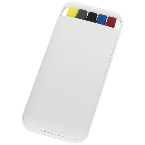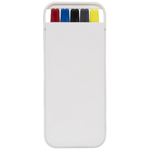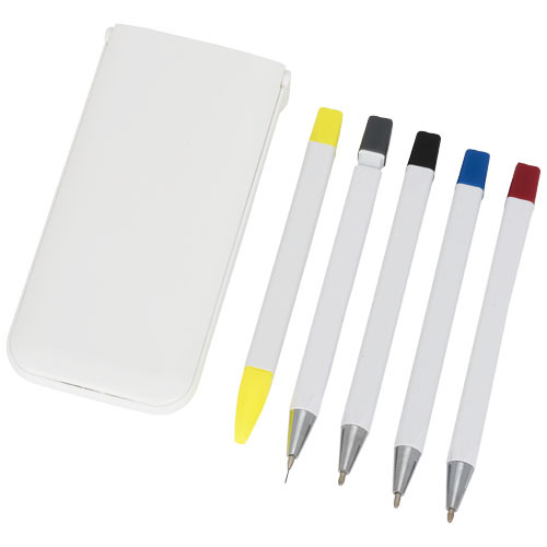 Questo set contiene tre penne a sfera colorate, una matita e un evidenziatore all'interno di una comoda custodia in plastica bianca.