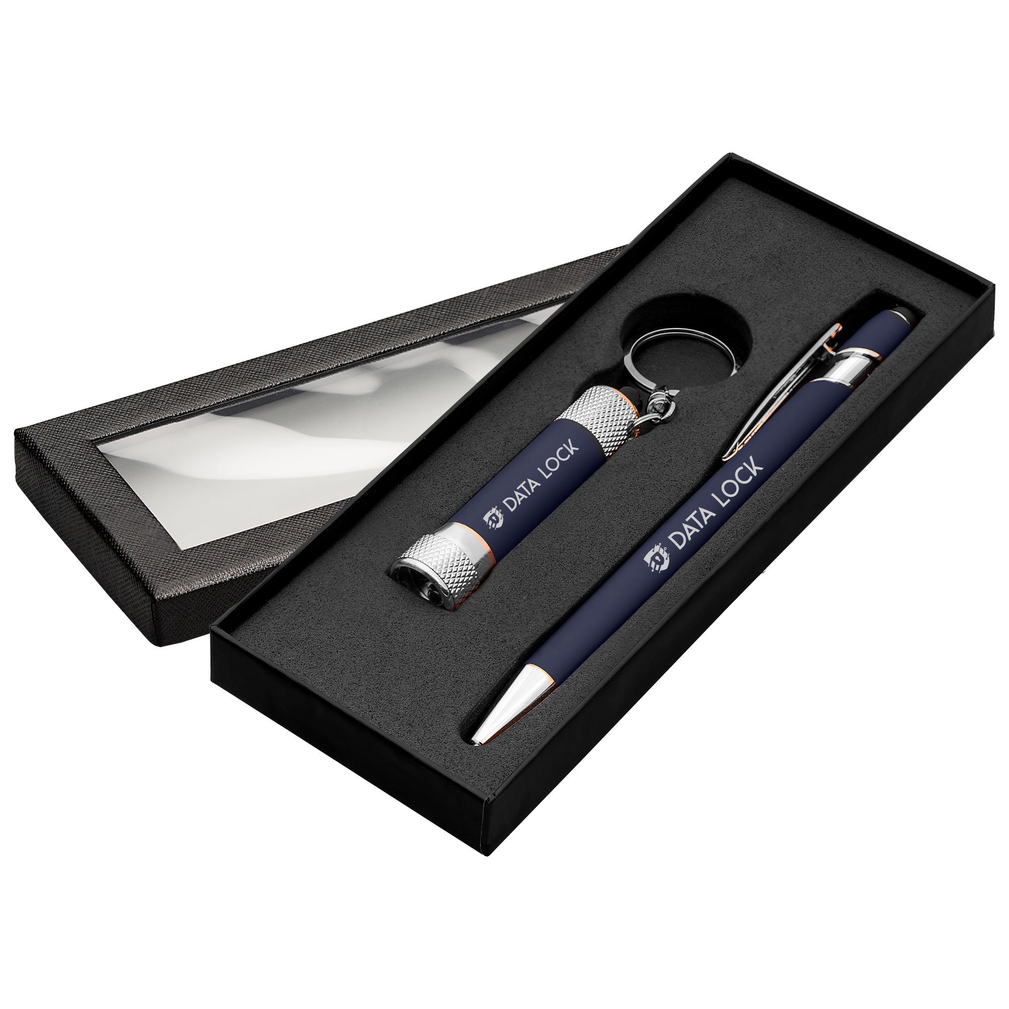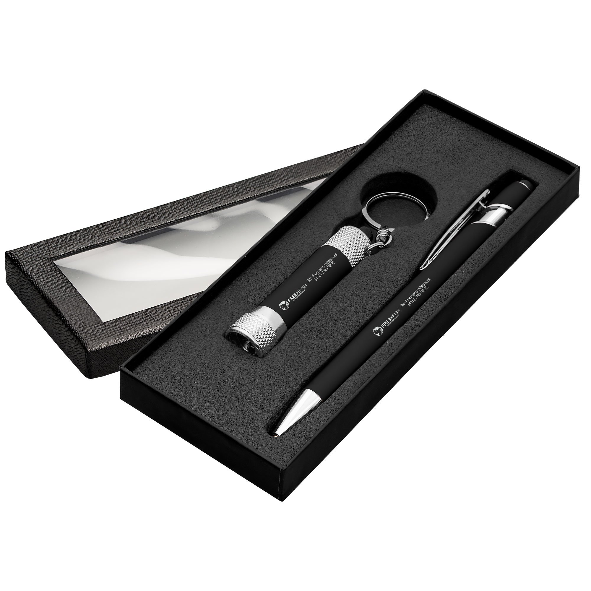 Set penna e portachiavi con torcia, in metallo con finitura gommata. Inchiostro penna: nero o blu. Fornito in cofanetto regalo. Il prezzo include la stampa su entrami gli articoli (penna e portachivi). Personalizzabile anche con incisione su richiesta.