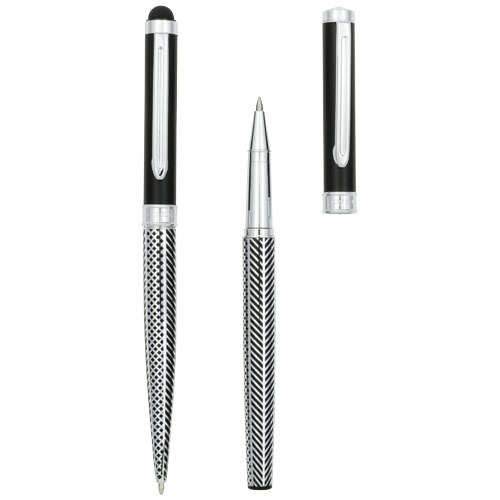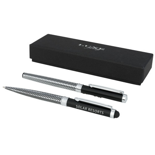 Set regalo dal design esclusivo con una penna stilo e una penna a sfera con parte inferiore del serbatoio caratterizzata da un motivo elegante e unarea superiore dedicata per scopi decorativi. Inclusa la ricarica di colore nero di qualità premium e confezionata in una scatola regalo "LUXE" (17 x 5,5 x 3 cm).