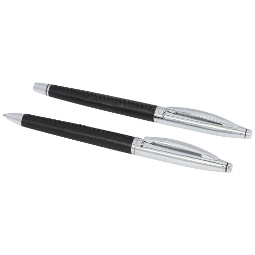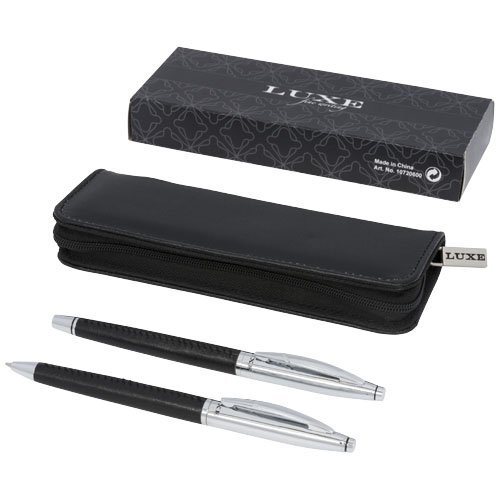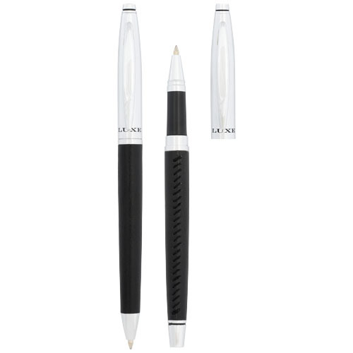 Set regalo con penna a sfera e penna roller dal design elegante ed esclusivo. Rivestimento in pelle con moderne cuciture a contrasto. Articolo fornito in custodia doppia in similpelle con confezione regalo "LUXE".