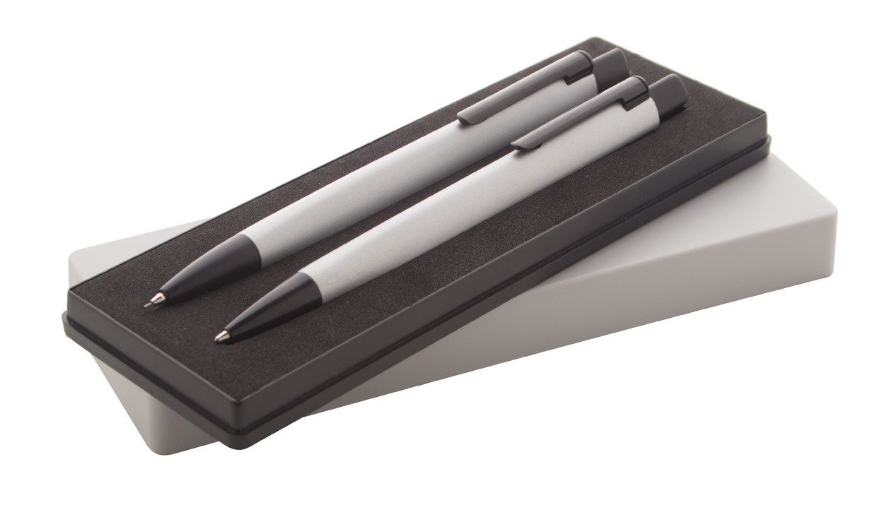 Set composto da una penna a sfera in alluminio ed una matita meccanica in confezione regalo di colore coordinato. Fornito con refill blu e con mina da 0,7 mm.