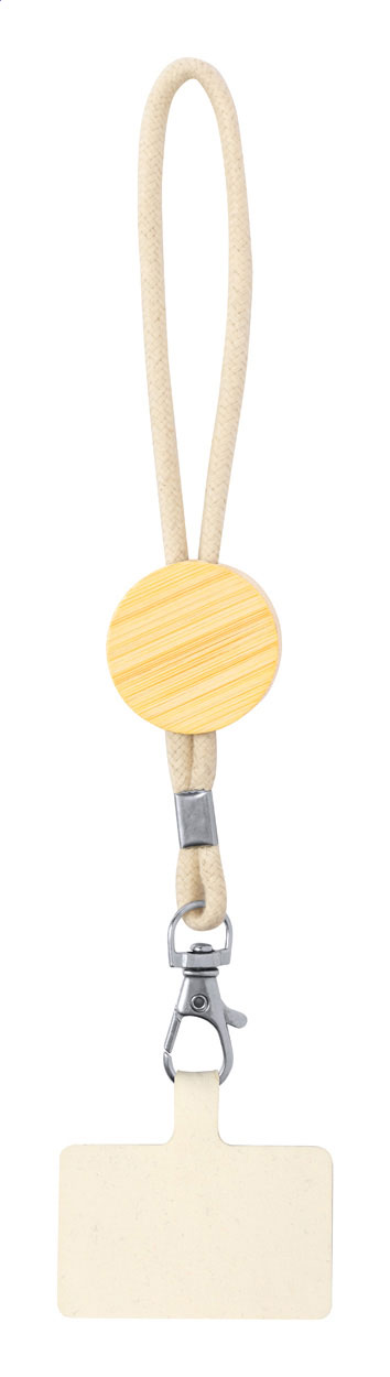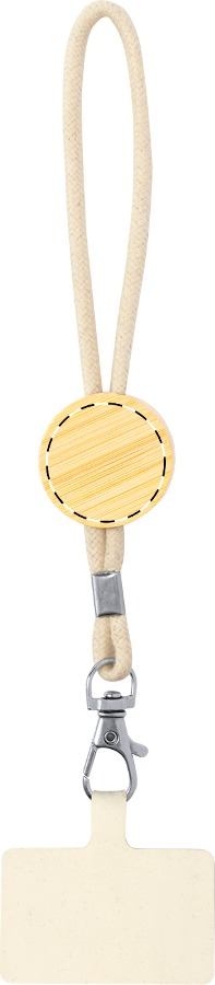 Cinturino da polso portacellulare, in cotone con piastrina rotonda in bambù, inserto per il telefono e moschettone in metallo. Articolo eco-friendly, ecologico e sostenibile.