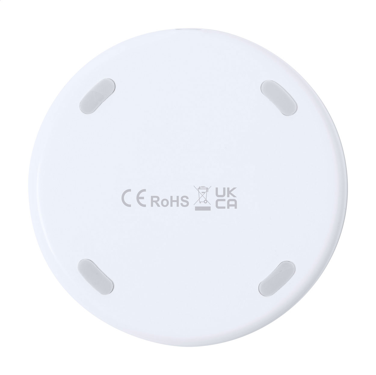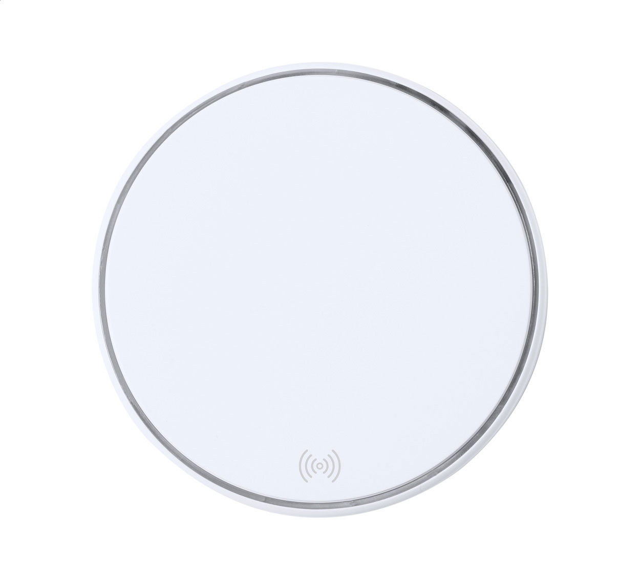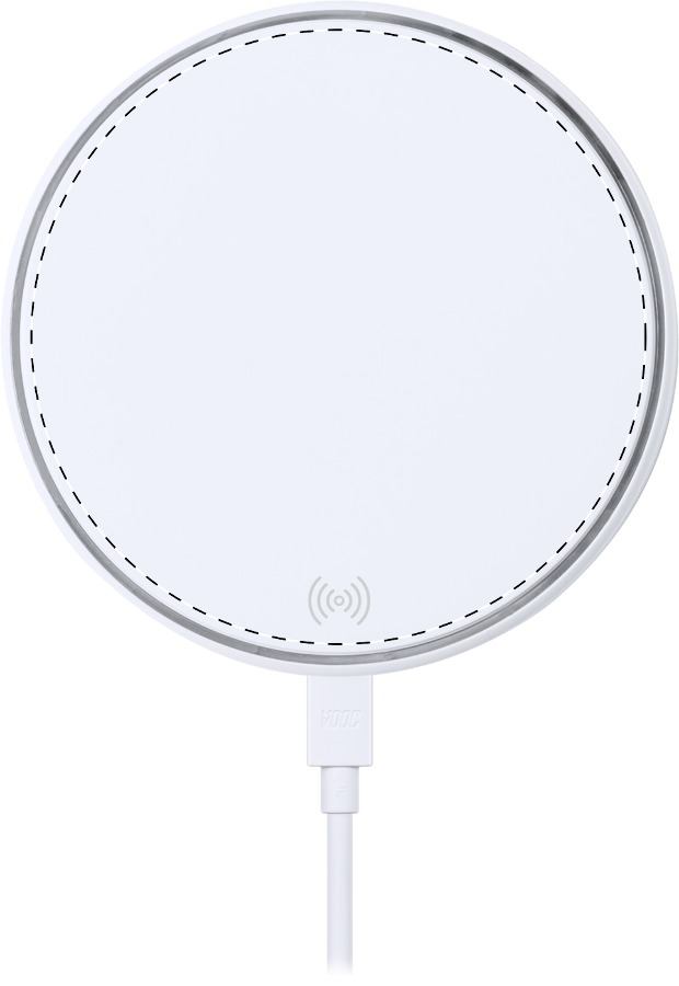 Caricabatterie rapido wireless (15W) con corpo in plastica. Incluso cavo di ricarica USB. Superficie personalizzabile con stampa a colori.