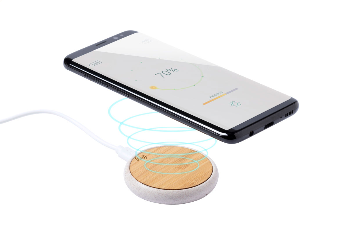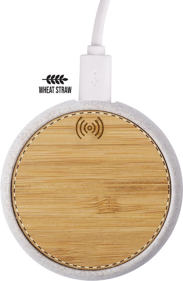 Caricabatterie wireless (10W) con corpo in bambù e plastica di paglia di grano ecologico. Cavo di ricarica USB incluso. Articolo eco-friendely, ecologico e sostenibile. Superficie personalizzabile con stampa a colori e incisione, anche nominativa.