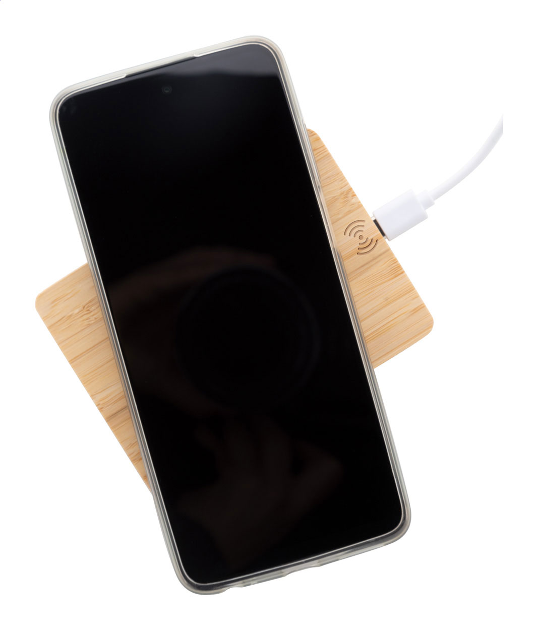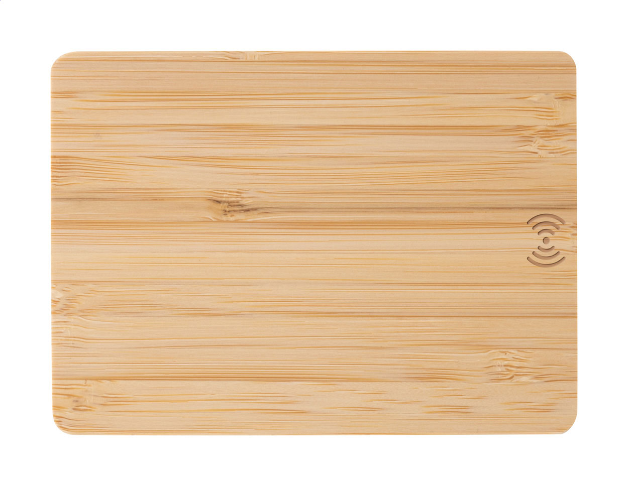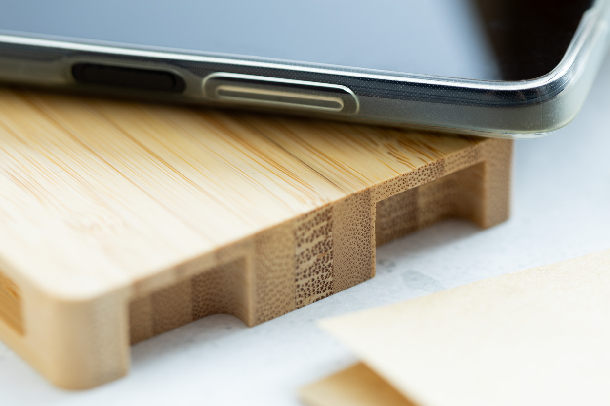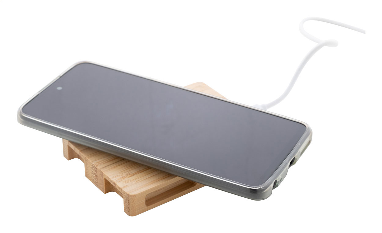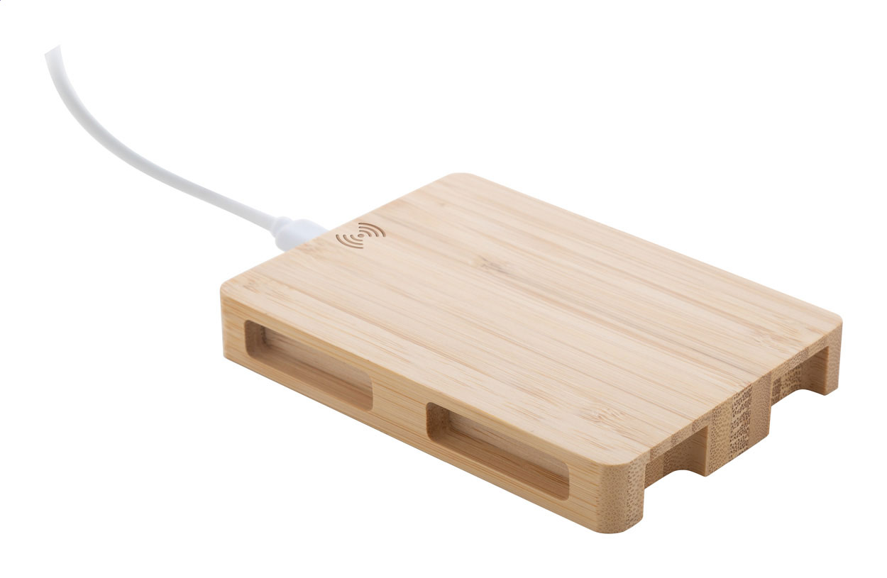Caricatore rapido wireless (10W) in bambù a forma di pallet. Cavo di ricarica USB incluso. Superficie personalizzabile con stampa a colori e incisione, anche nominativa.