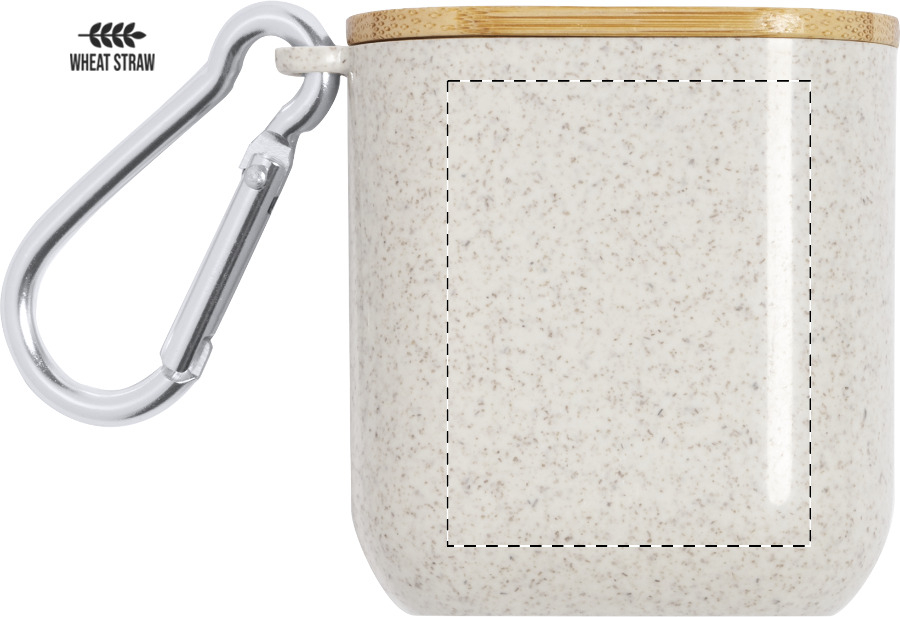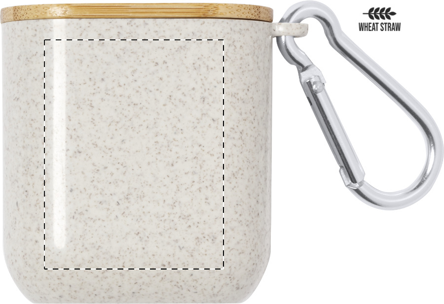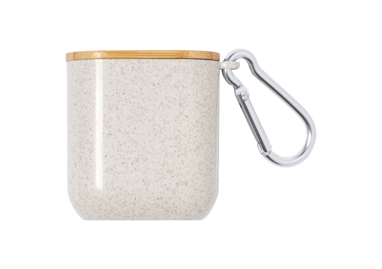 Cavo di ricarica USB in astuccio di plastica ecologica in paglia di grano con moschettone e coperchio portacellulare in bambù. Con connettori micro USB, USB-C, Lightning ed ingressi USB e USB-C. Articolo eco-friendly, ecologico e sostenibile.