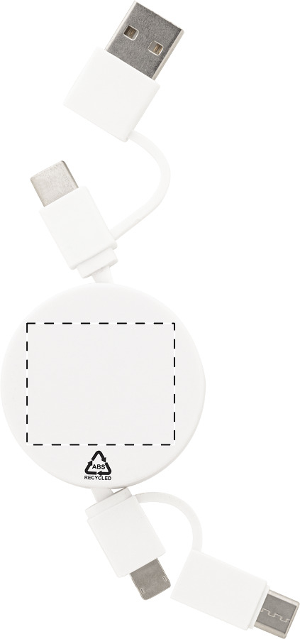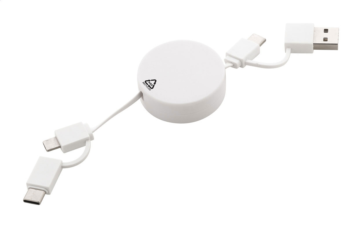 Cavo di ricarica USB telescopico in ABS riciclato con connettori micro USB, USB-C, Lightning ed ingressi USB e USB-C. Personalizzabile. Articolo eco-friendly, ecologico e sostenibile.