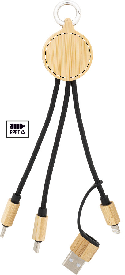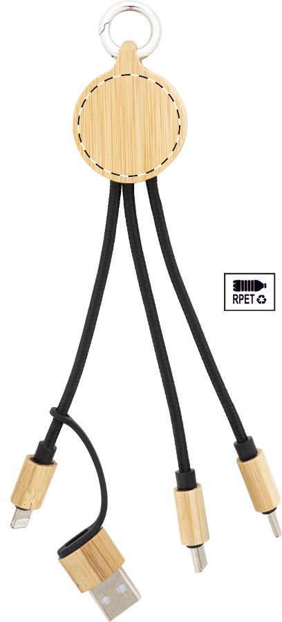 Gruppo cavi di ricarica USB in RPET e bambù con connettori micro USB, USB-C e Lightning, ingressi USB e USB-C e portachiavi. Personalizzabile. Articolo eco-friendly, ecologico e sostenibile.