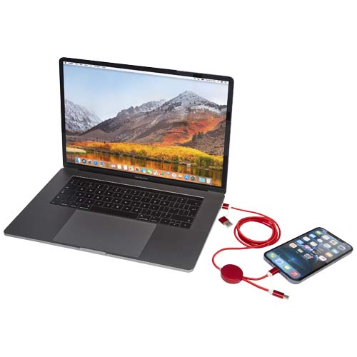 Cavo 5-in-1 per la sincronizzazione dei dati e la ricarica rapida da 27 W, in alluminio e plastica riciclati. Connettori di ingresso USB-A e di Tipo-C abbinati a un connettore di uscita combinata di Tipo-C e Lightning/Micro USB. La connessione da USB-A a USB-C fornisce una potenza massima di 27 W, mentre tutte le altre opzioni di connessione offrono una potenza massima di 15 W. Compatibile sia con CarPlay e Android Auto. Lunghezza del cavo: 150 cm. Articolo eco0-friendly, ecologico e sostenibile.