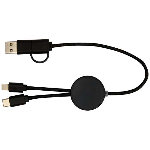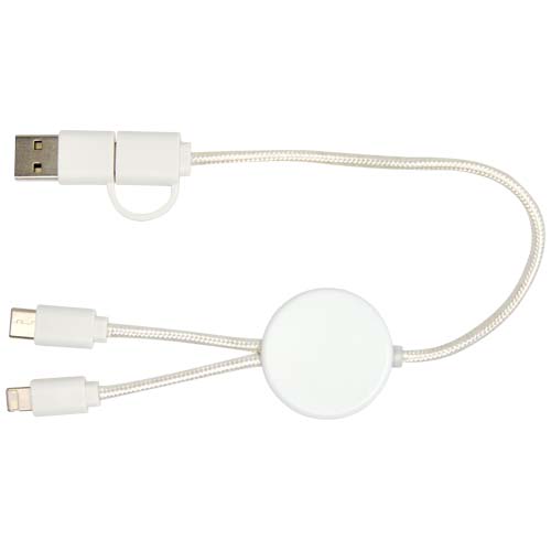 Cavo 5-in-1 per la sincronizzazione dei dati e la ricarica rapida da 27 W in plastica riciclata. Connettori di ingresso USB-A e di Tipo-C abbinati a un connettore di uscita combinata di Tipo-C e Lightning/Micro USB. La connessione da USB-A a USB-C fornisce una potenza massima di 27 W, mentre tutte le altre opzioni di connessione offrono una potenza massima di 15 W. Compatibile sia con CarPlay e Android Auto. Lunghezza del cavo: 30 cm. Articolo eco-friendly, ecologico e sostenibile.